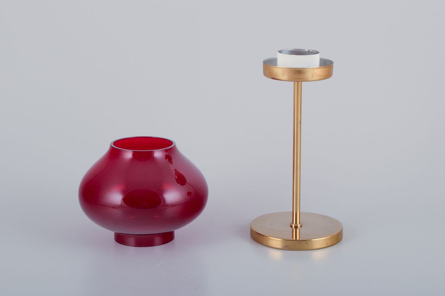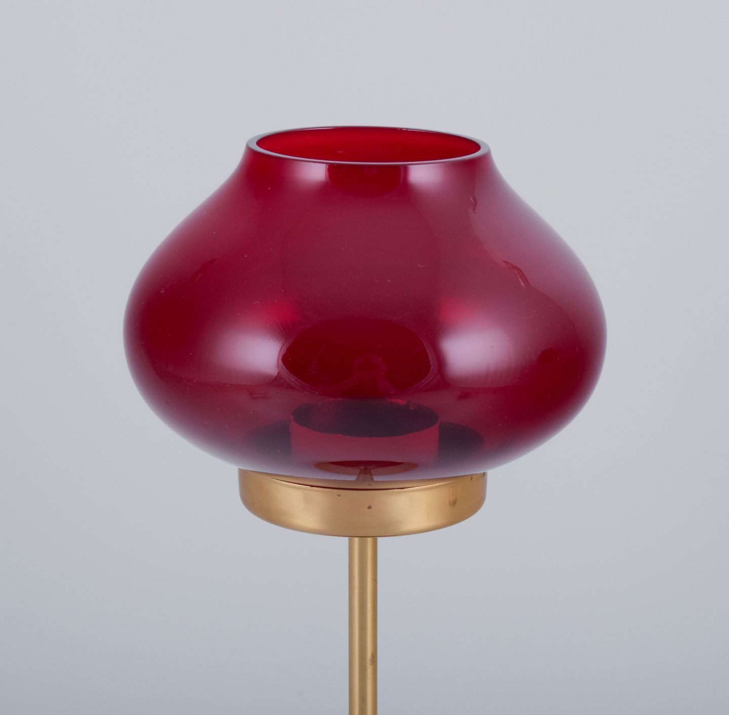 Et par fyrfads lysestager i messing med vinrøde glasskærme.