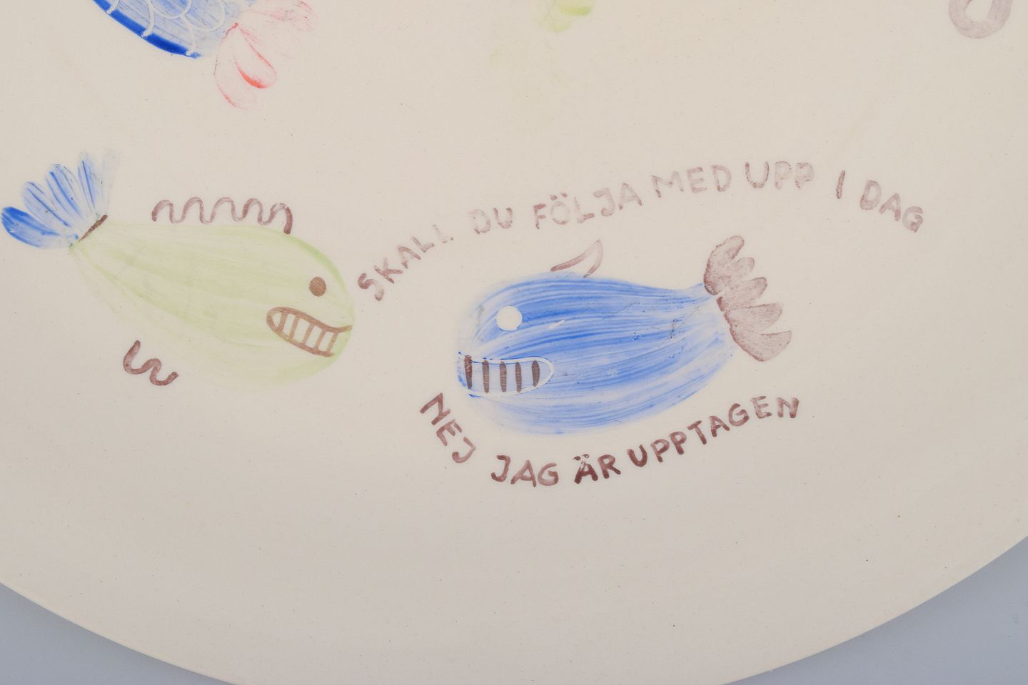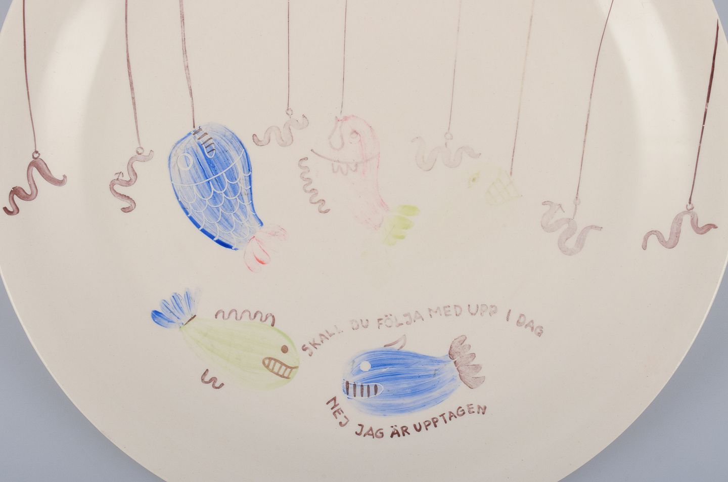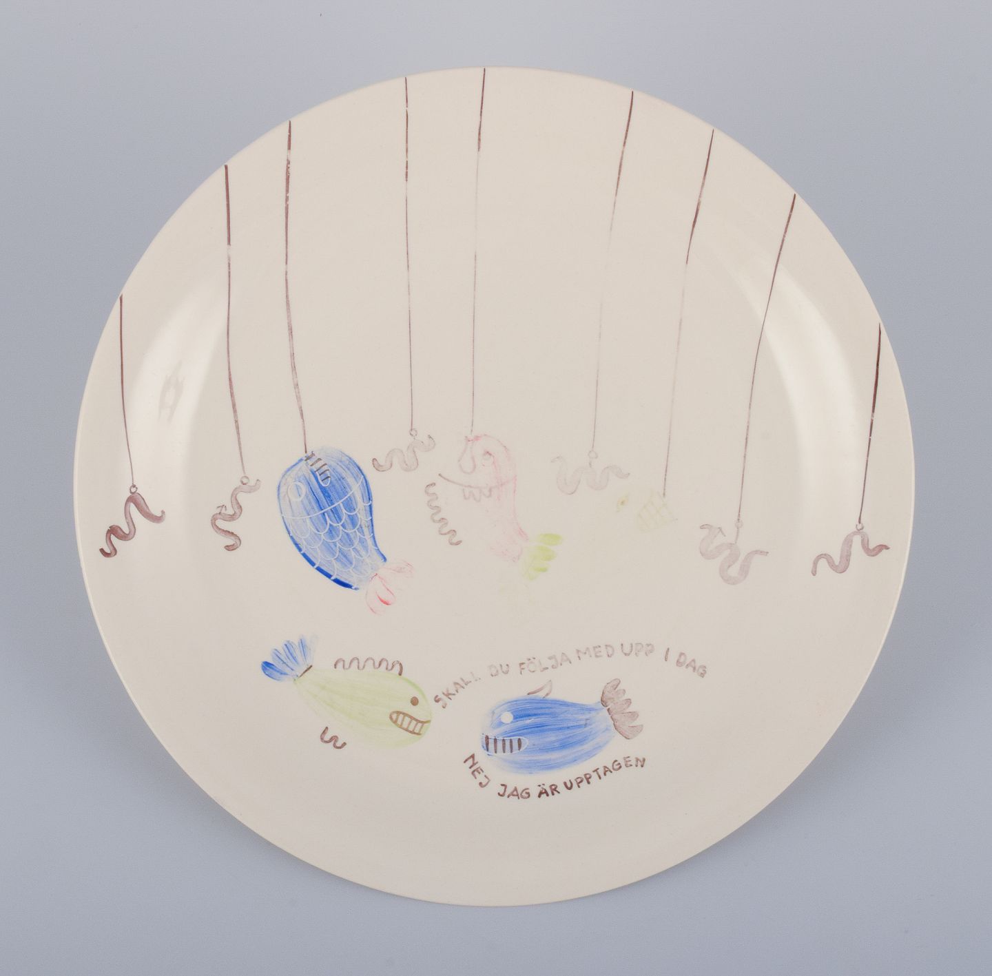Stig Lindberg for Gustavsberg. "Löja" tallerken. Håndmalet med fiskemotiv. Satirisk motiv med svensk tekst.