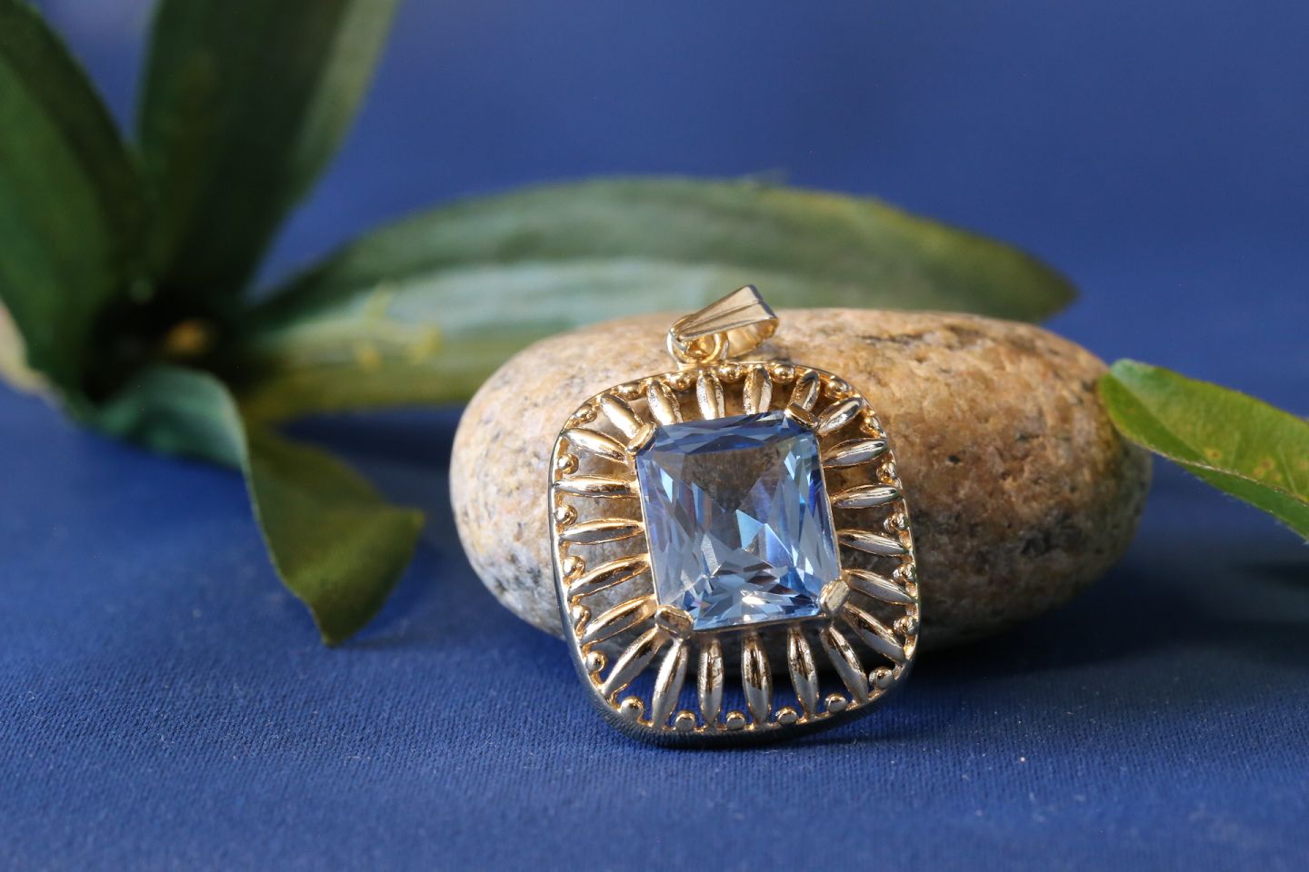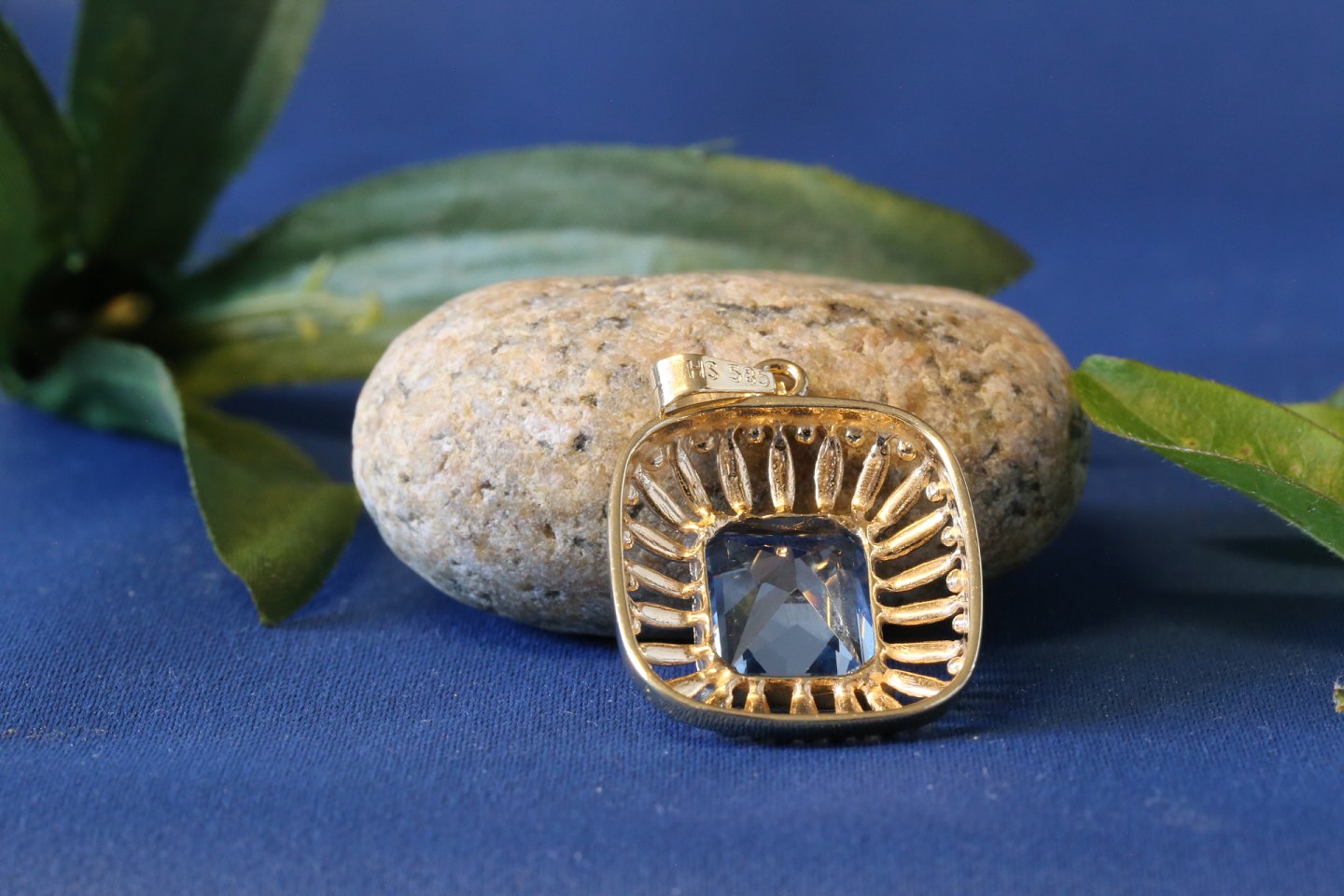 Vedhæng i 14 karat guld, med indlagt blå sten, designet af Hermann Siersbøl