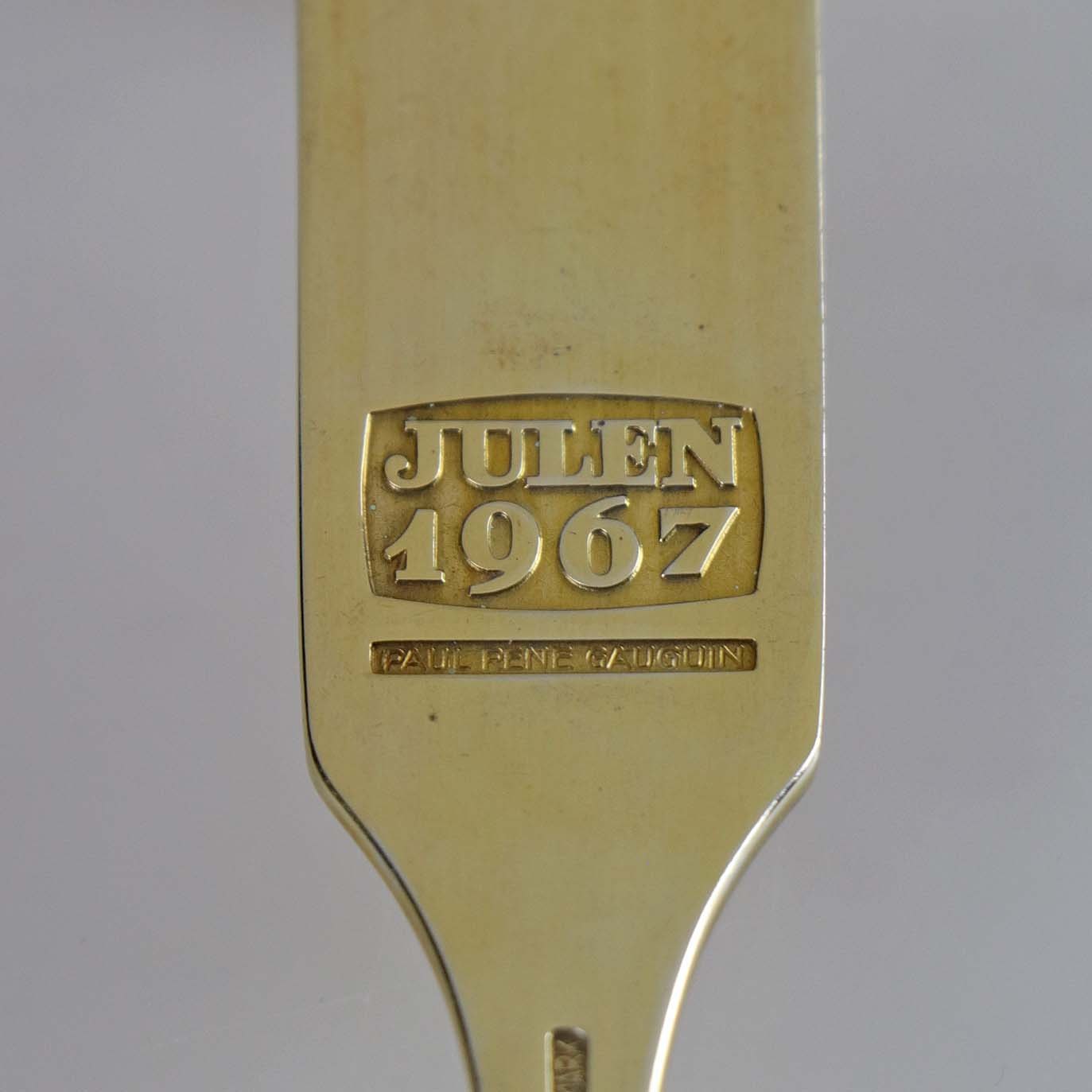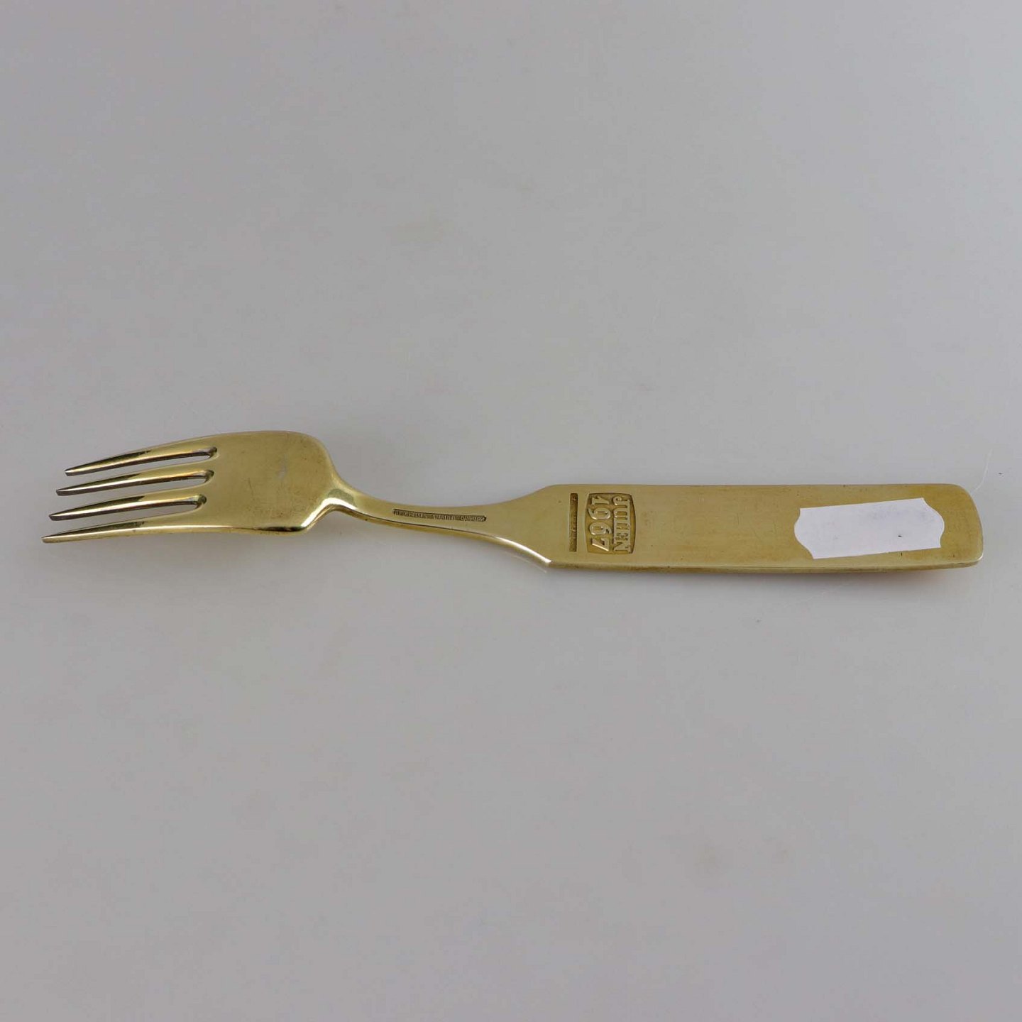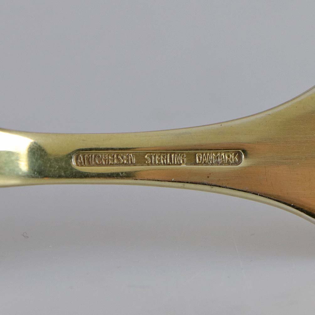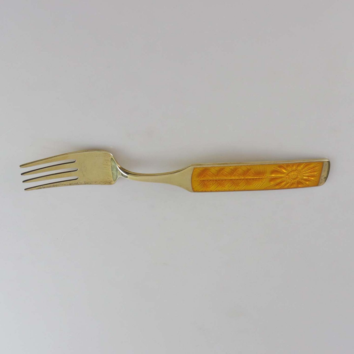 Årsgaffel fra julen år 1967 i forgyldt sterling sølv indlagt mønster i gyldent emalje