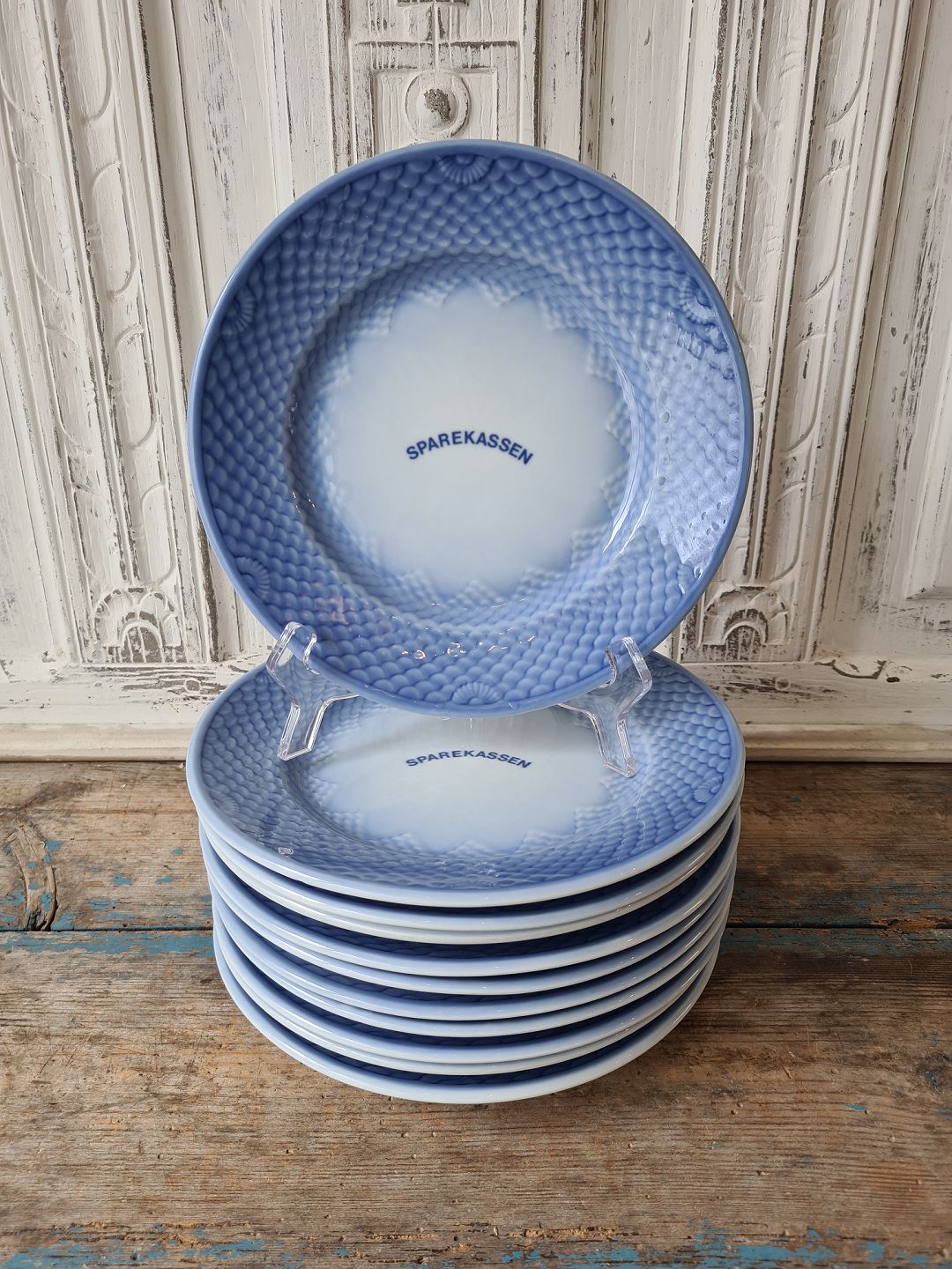 B&G Blå Tone frokosttallerken med logo "Sparekassen"