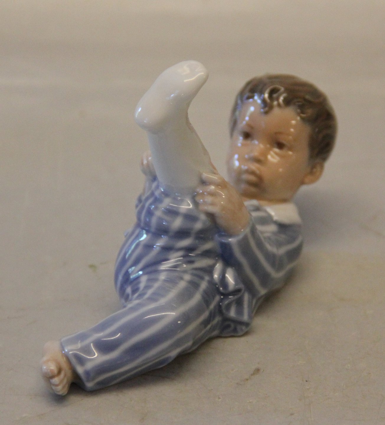 Royal Copenhagen 3580 Dreng liggende på ryggen i pyjamas 6 x 15 cm og i hel stand Dreng i Nattøj