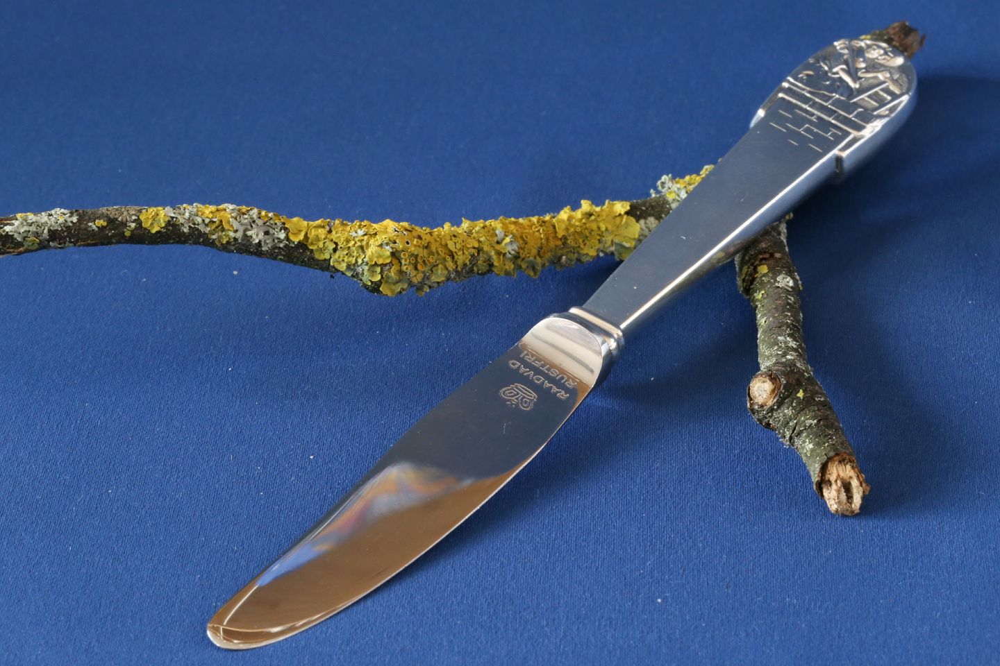 Fin lille barnekniv med motiv af H.C. Andersen, hyrdinden og skorstensfejeren. Kniven er udført med massivt skaft af 3-tårnet sølv, og motivet smukt graveret ind i enden.