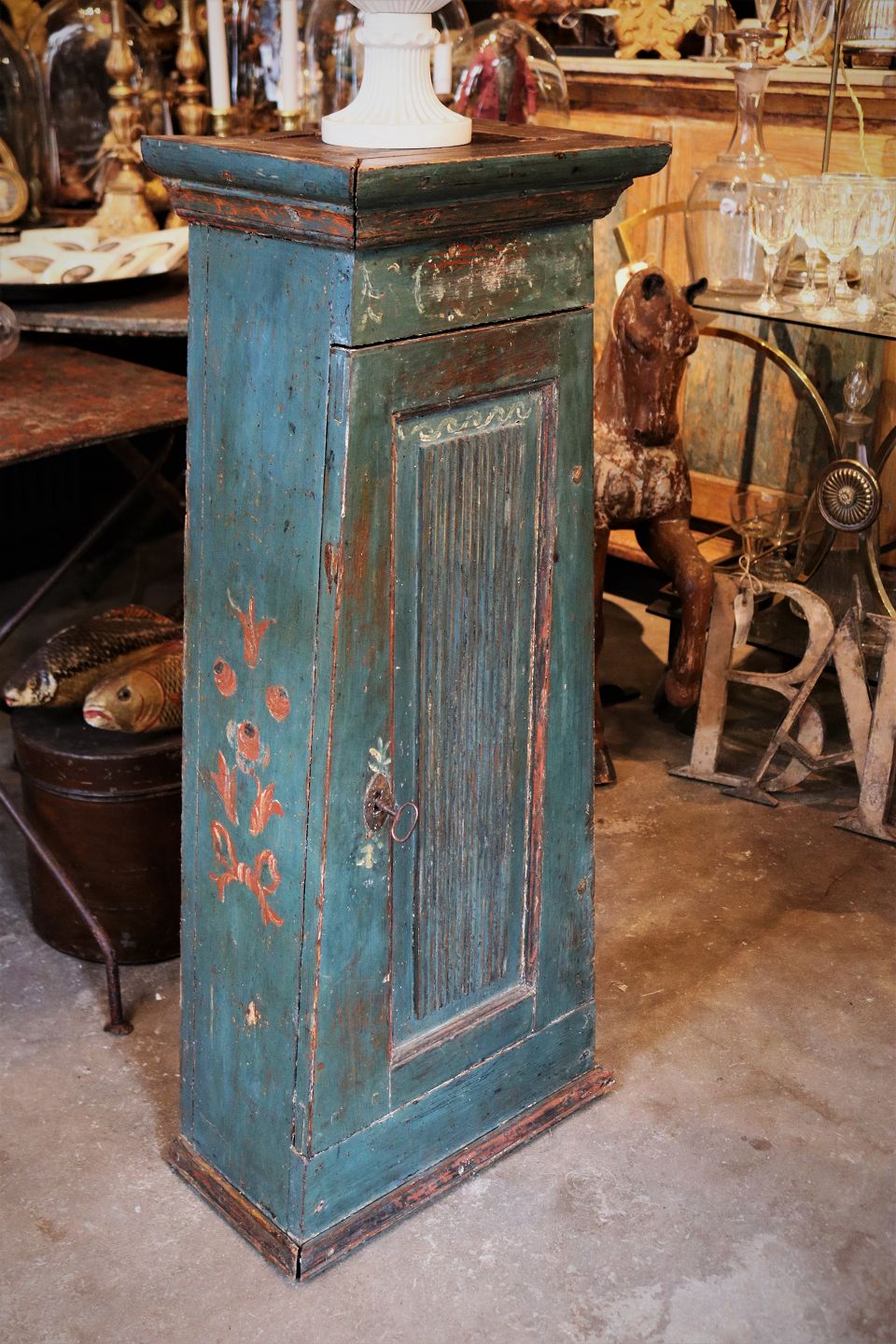 Svensk 1800 tals gustaviansk piedestal skab med profileret låge og original blå farve med fin patina og blomster dekoration på siden.