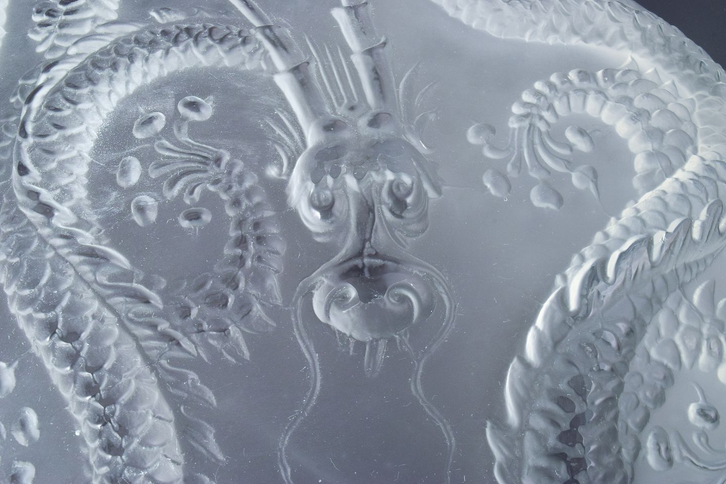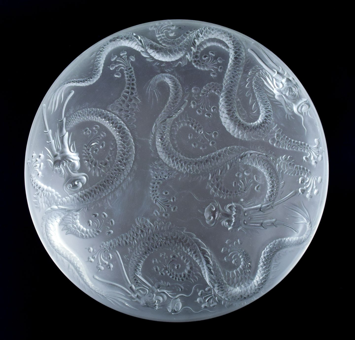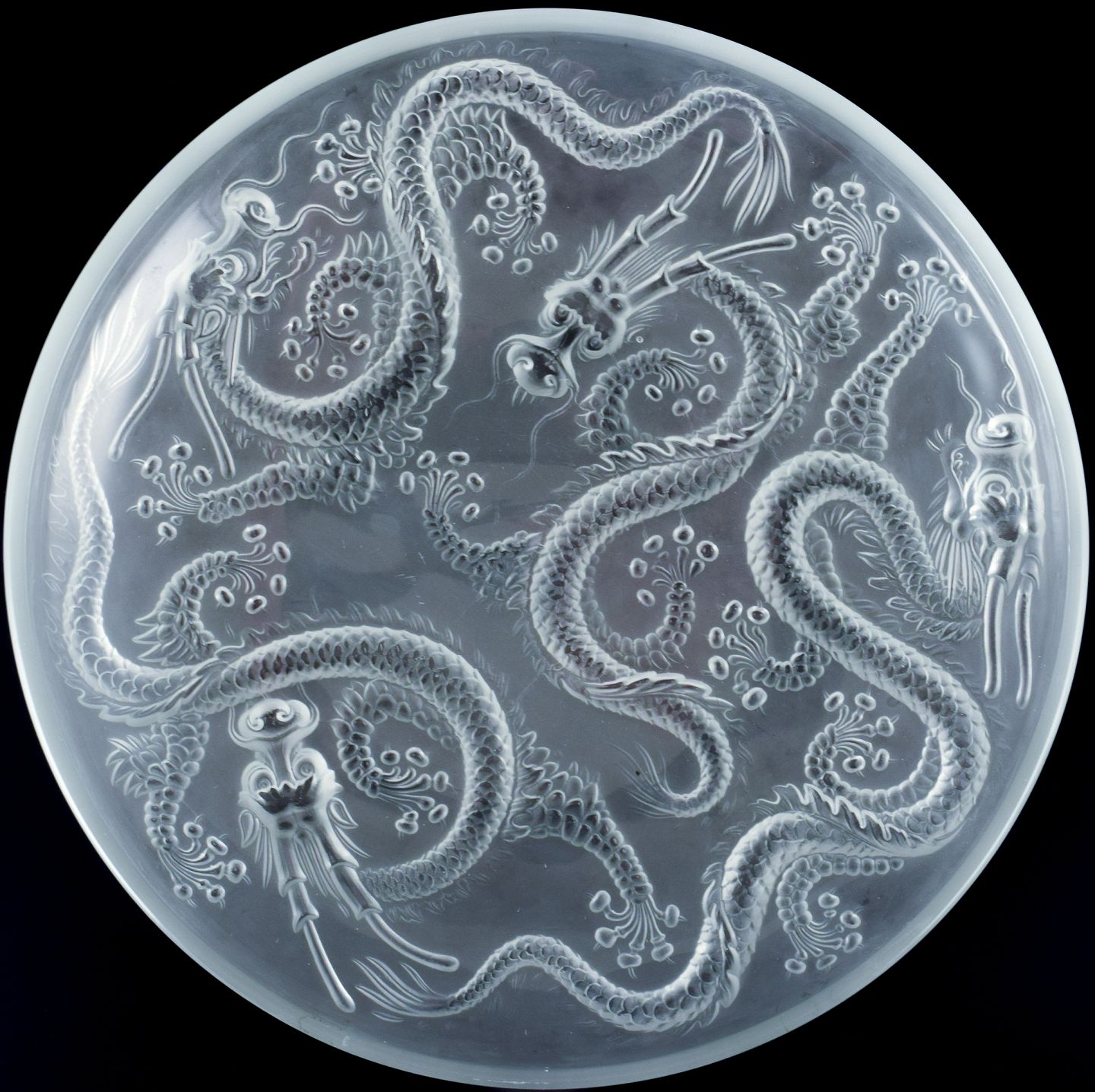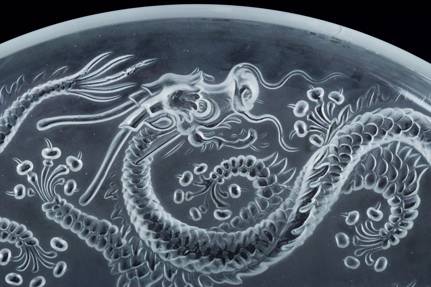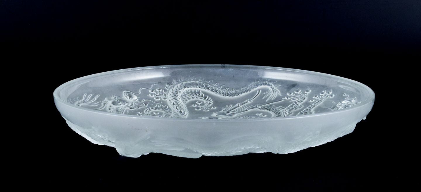 Josef Inwald, kolossal Art Deco kunstglasskål i Barolac glas, designet med drager i orientalsk stil.
