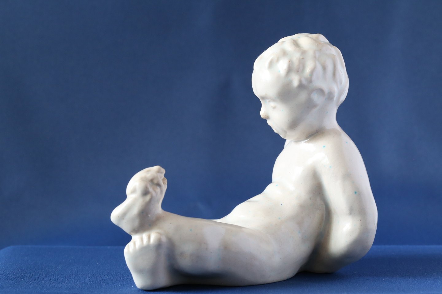 Dreng med frø i fajance, hvid med glasur. Michael Andersen. Dek. nr. 4900