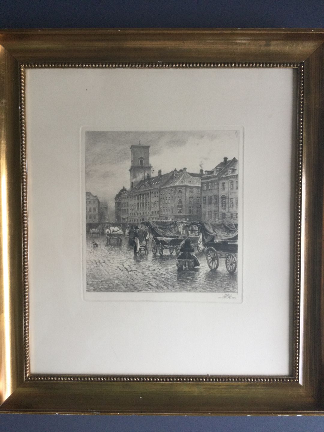Radering af Peter Tom-Petersen - Nytorv i København med slagtervogne og Vor Frue Kirkes Tårn 1905.