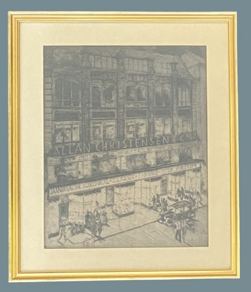 Etching with a motif from Foreningslivet on the line ca. 1935. You can see shops such as: Allan Christensen & Co. Scandinavian Music Publisher. K. G Niesen. E & D Garden. Peter Sørensen. Dimensions: 32 x 27 cm. (24 x 19 cm.)
