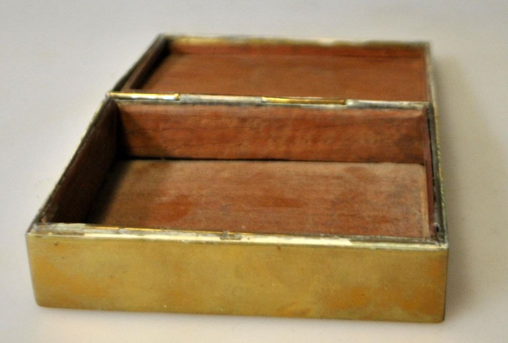 Kinesisk cigaret etui i messing, 20. årh. Låg dekoreret med drage. Stemplet: China. 10 x 8 x 3 cm. Indvendig beklædt med mahogni.