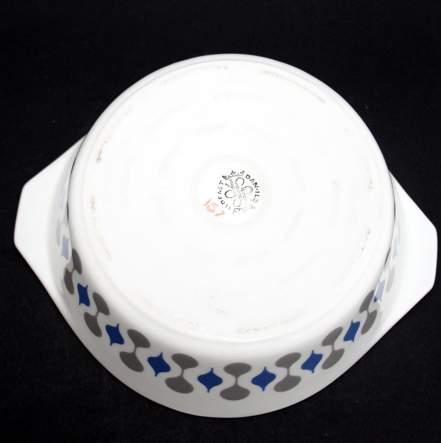 Text available in Danish: Lyngby, Dan-ild 66. Design Axel Brüel. Gratinskål med ører mellemstørrelse. Højde 5,3 cm. Diameter 15,3 cm. Flot stand. Pris: 225 kr. stk. Lager: 1