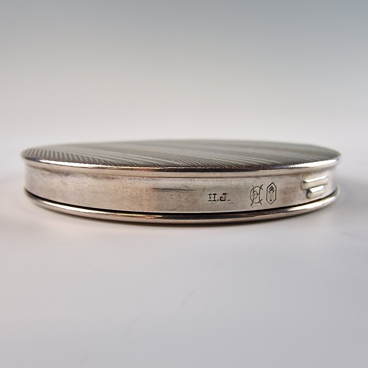 Pudderdåse af pletsølv med 2 låge, et med spejl og et til pudderet. Låget er dekoreret med striber. Arkivfoto, brugsspor i bund.