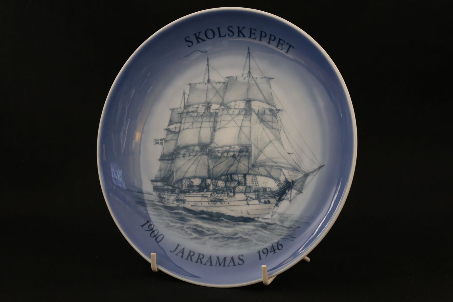 Skibsplatte Bing & Grøndal, No. 10, fra 1986. Platten er bemalet med Skolskeppet, med teksten 1900 Jarramas 1946. Der er tekst om skibet på bagsiden af platten.