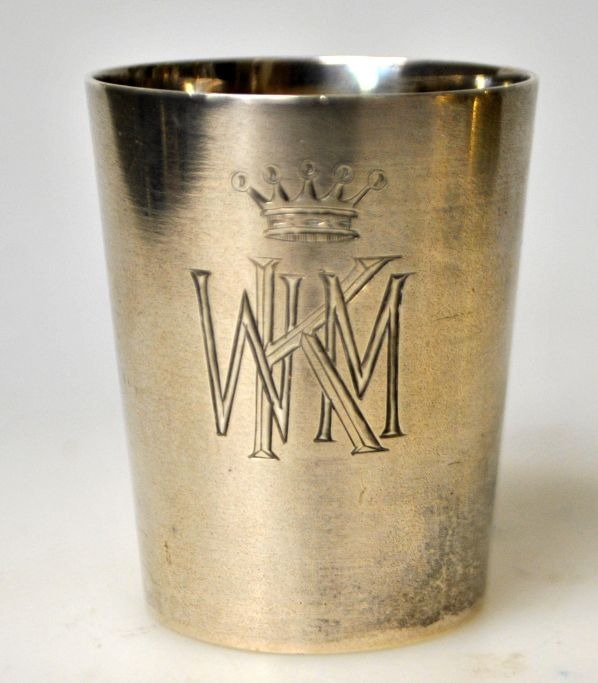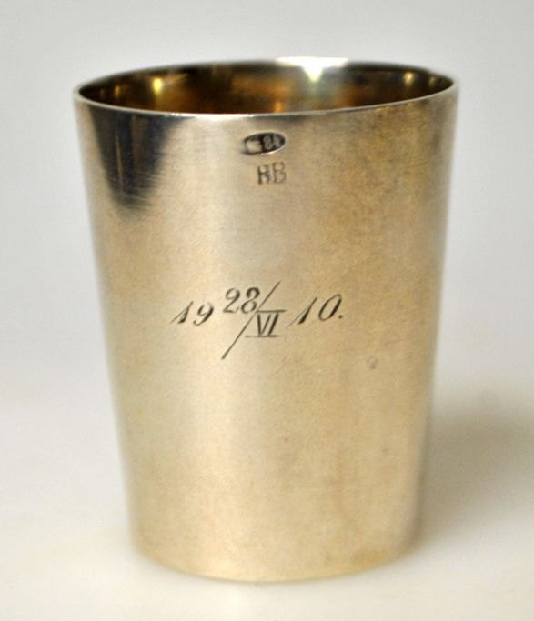 Russisk sølv bæger, 1910. Konisk. Stemplet: HB. Med hertug krone og monogrammet: WKM. Endvidere dato: 28.VI.1910. H.: 4,5 cm. Vægt: 24,8 gram.