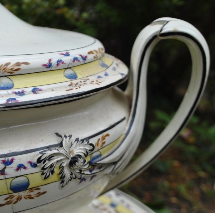 Stor terrin med underfad, Wedgwood, England, 18. årh. Cream ware - pearlware. Med håndmalede blomsterdekorationer og blomsterdekorationer i relief på kant. Højde med fad: 35 cm. Længde terrin: 40 cm. Længde fad: 43 cm. Stemplet: E. Mayer no. 313.