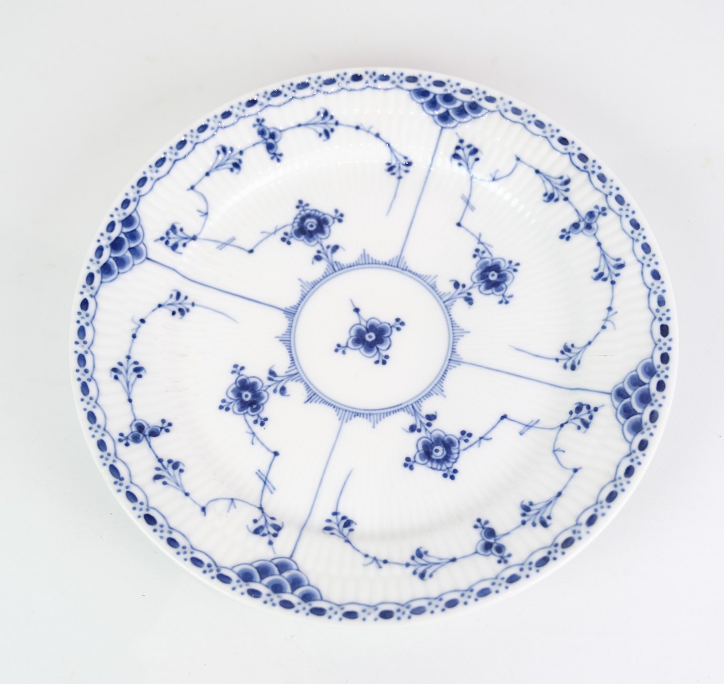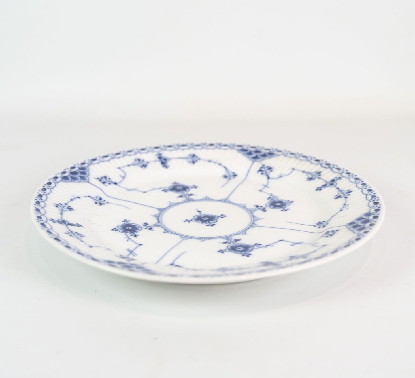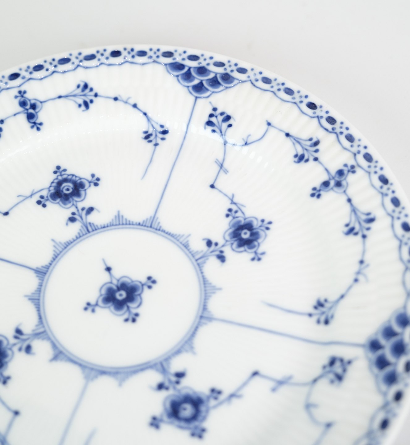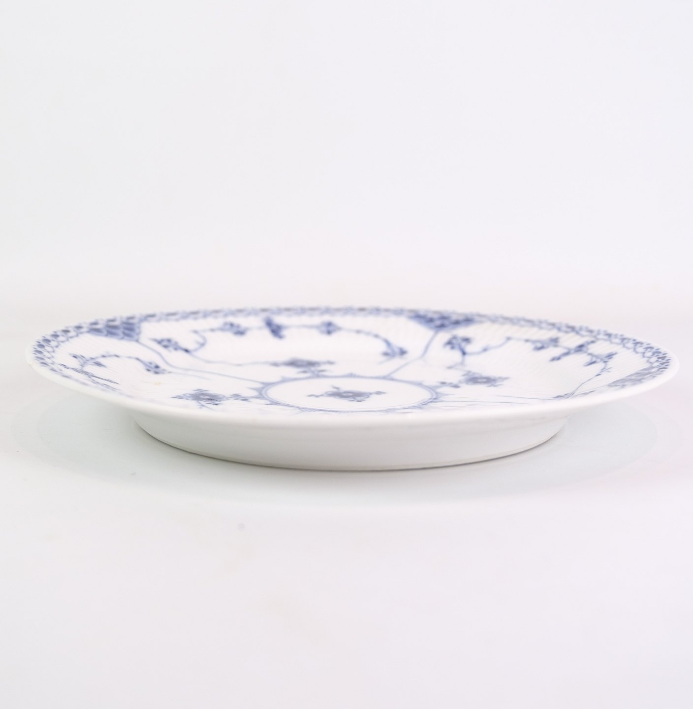 Dette serveringsfad er en del af den ikoniske Musselmalet Riflet-serie, der er kendt for sit karakteristiske Riflet-mønster. Mønsteret består af delikate blåmønstre, der pryder fadets overflade og giver det et klassisk og sofistikeret udseende.