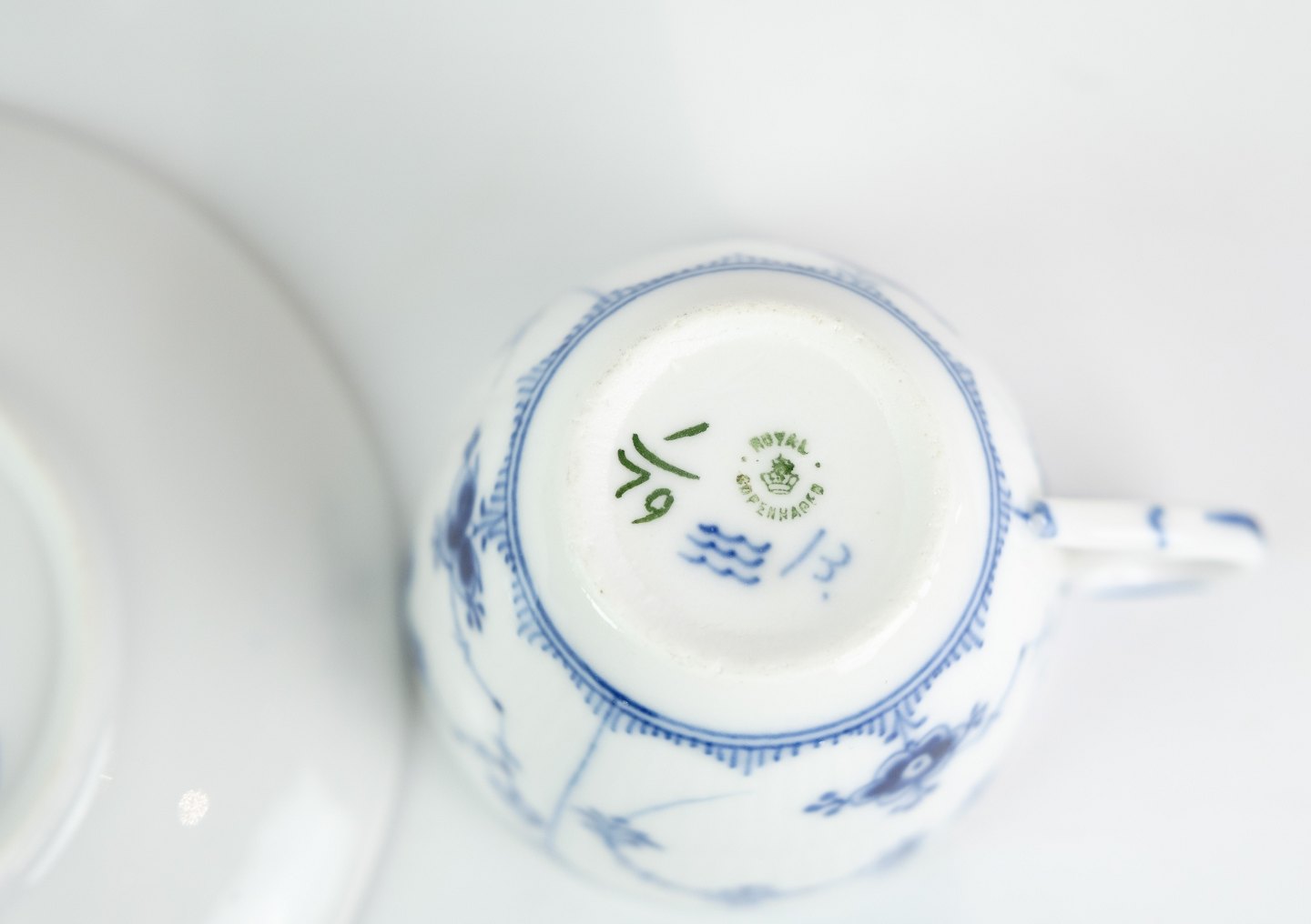 Royal Copenhagen Musselmalet Riflet er en ikonisk serie af porcelæn, der har fortryllet generationer med sit tidløse design. Den store kaffekop i denne serie, med dekorationnummer 1/79 med tilhørende underkop nr. 79-82, som er en skøn tilføjelse til enhver samling af porcelæn.