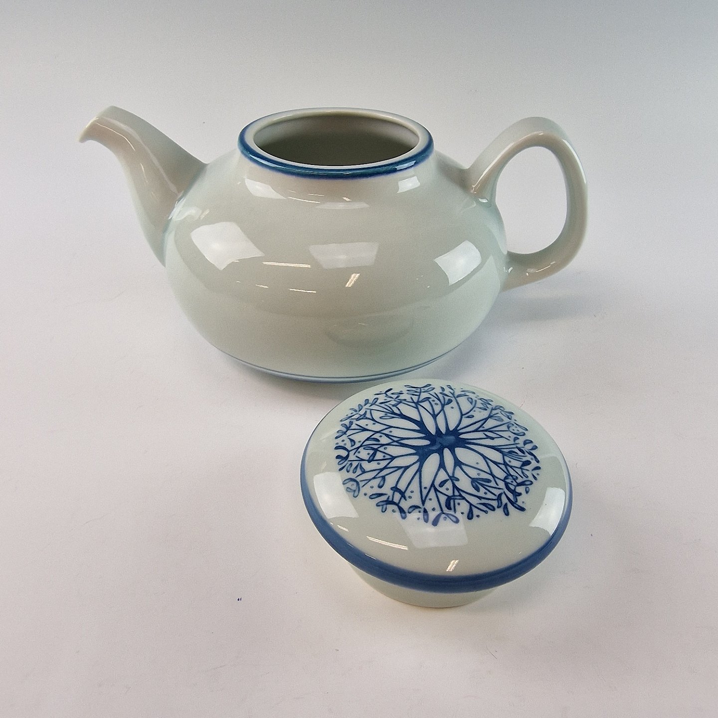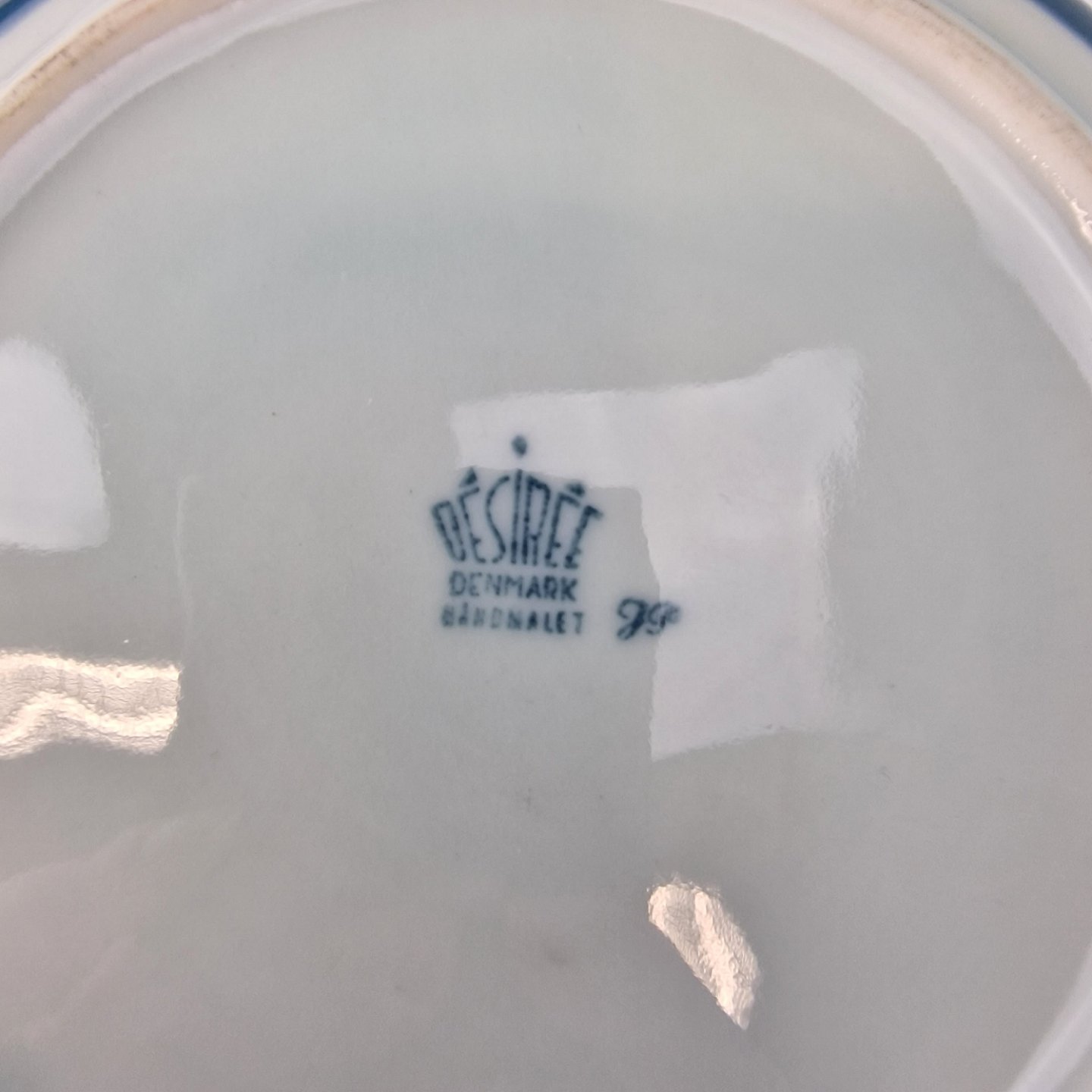 Stellets runde former er dækket med en silkeblød glasur og håndmalet med er lys almueblå farve lagt under glasuren. Stellet er ovnfast