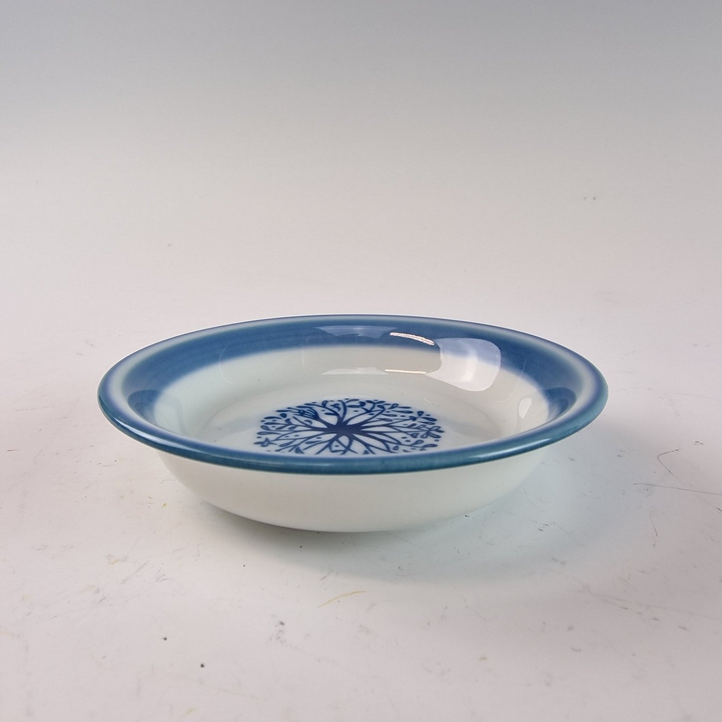 Stellets runde former er dækket med en silkeblød glasur og håndmalet med er lys almueblå farve lagt under glasuren. Stellet er ovnfast