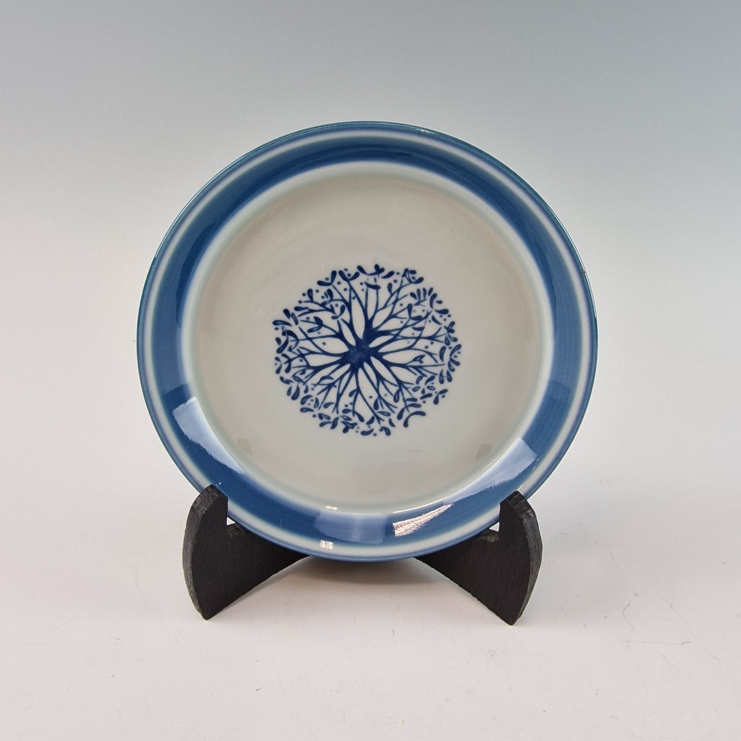 Stellets runde former er dækket med en silkeblød glasur og håndmalet med er lys almueblå farve lagt under glasuren. Stellet er ovnfast