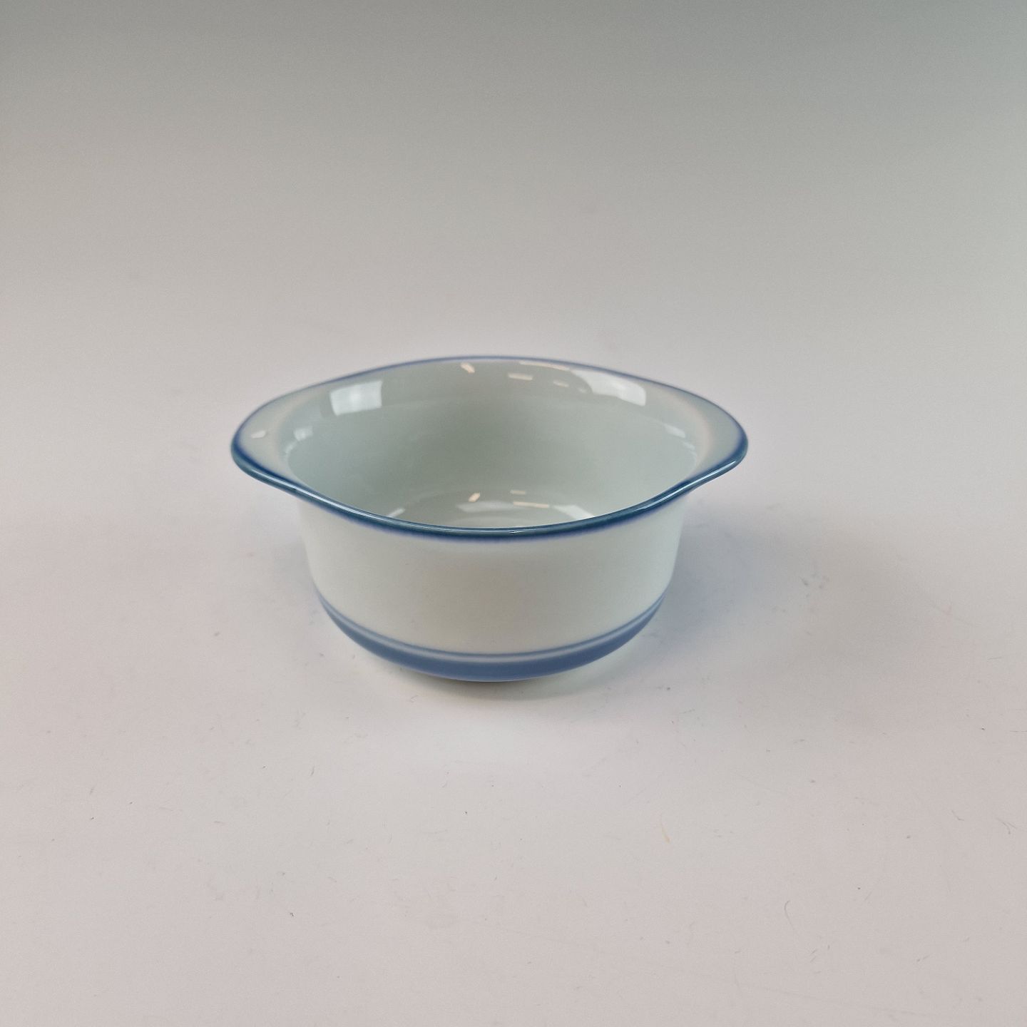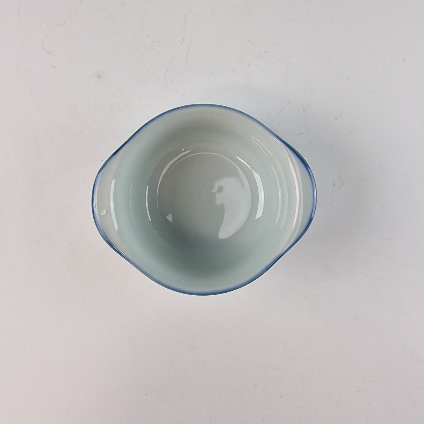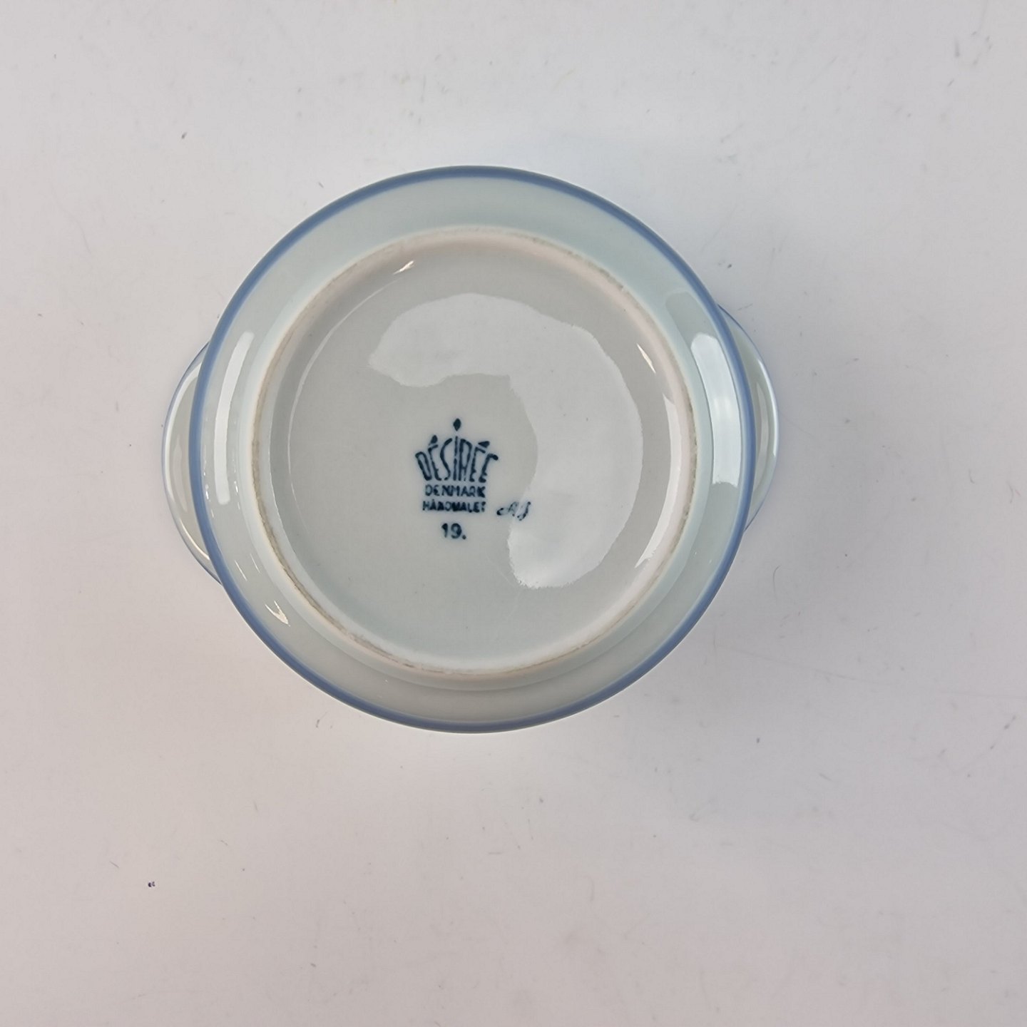Stellets runde former er dækket med en silkeblød glasur og håndmalet med er lys almueblå farve lagt under glasuren. Stellet er ovnfast