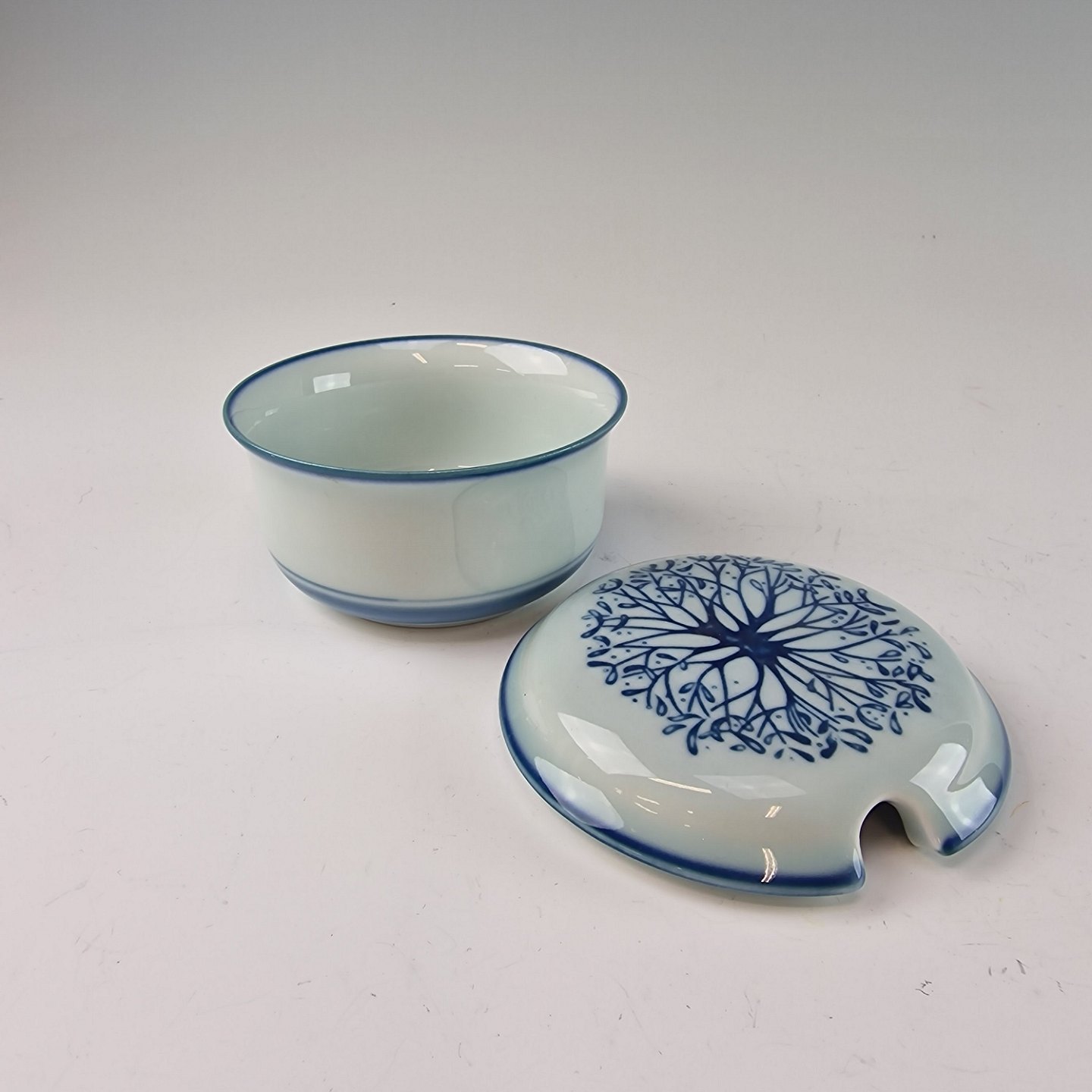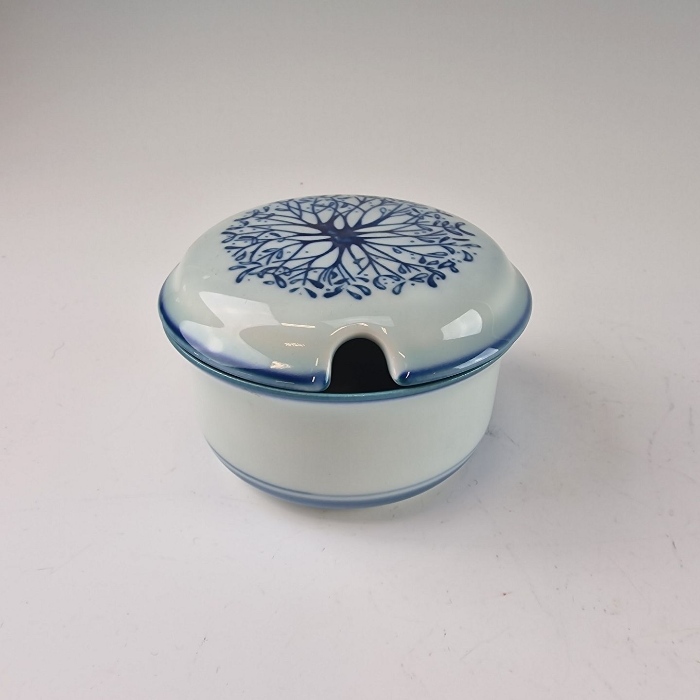 Stellets runde former er dækket med en silkeblød glasur og håndmalet med er lys almueblå farve lagt under glasuren. Stellet er ovnfast