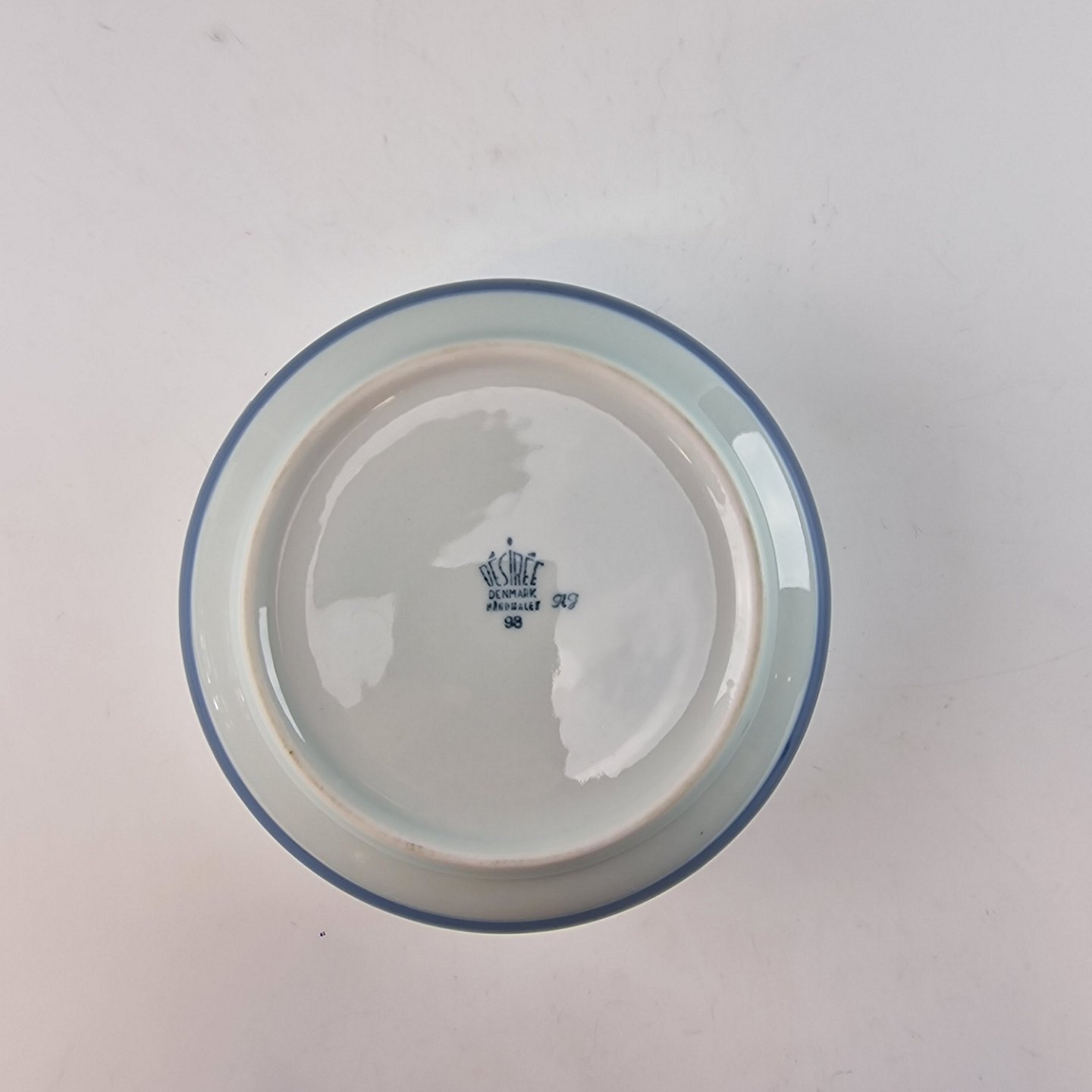 Stellets runde former er dækket med en silkeblød glasur og håndmalet med er lys almueblå farve lagt under glasuren. Stellet er ovnfast