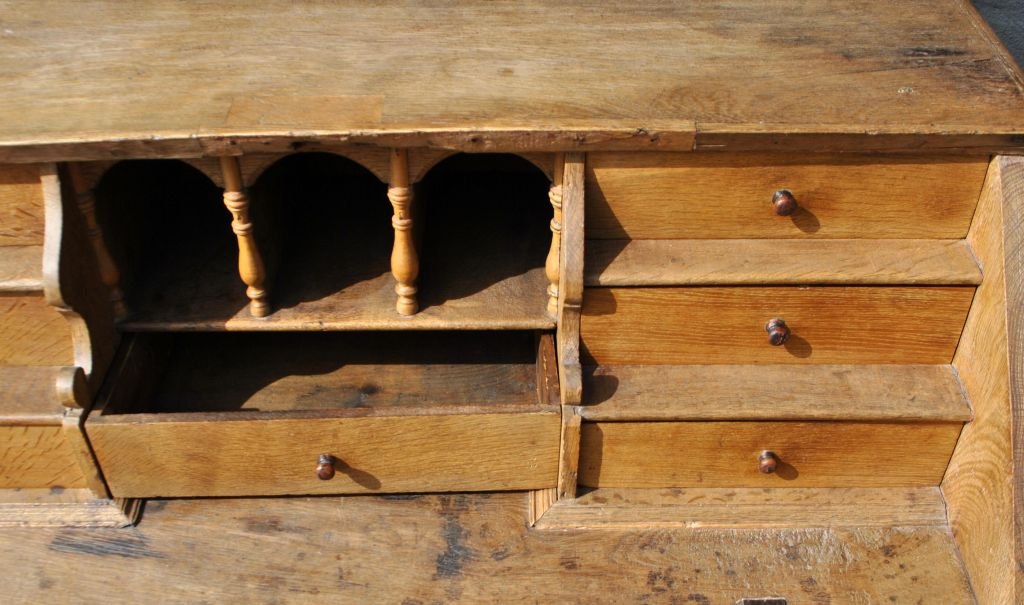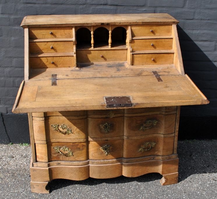 Barokt egechatol, 18. årh. Danmark. Ligeknækket rococo. H.: 87 cm. B. 91 cm. D.: 47 cm. Under skriveklap, 3 rum og 7 skuffer. Under plade 3 store skuffer og arkiv skuffe.
