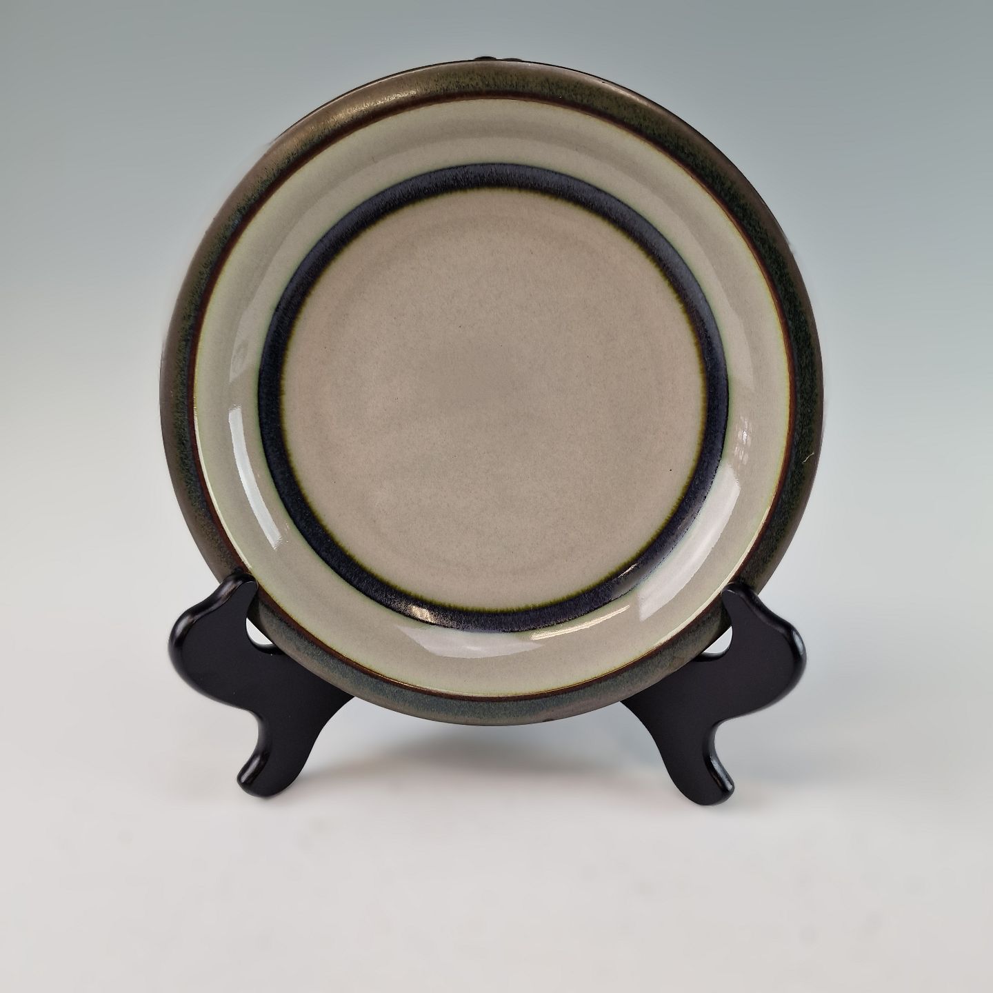 Stellet Tema er af stentøj, glaseret med lys grå og dekoreret med kanter af grønne og brune farver