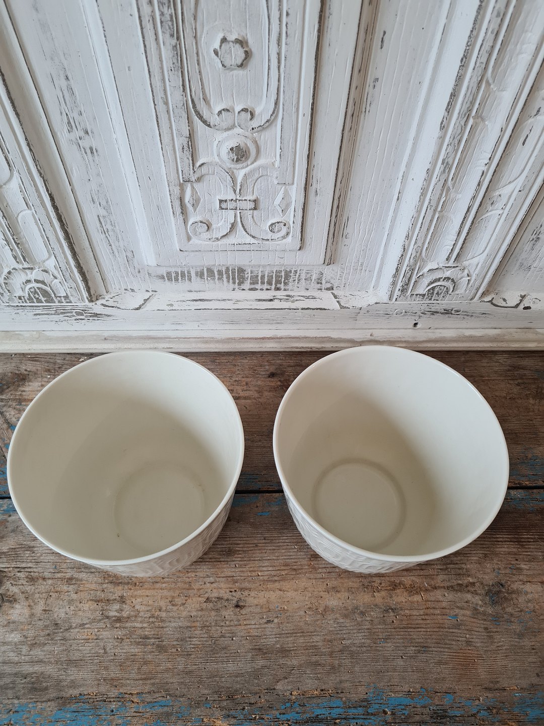 Royal Copenhagen par urtepotteskjulere i Blanc de Chine dekoreret med geometrisk mønster i relief