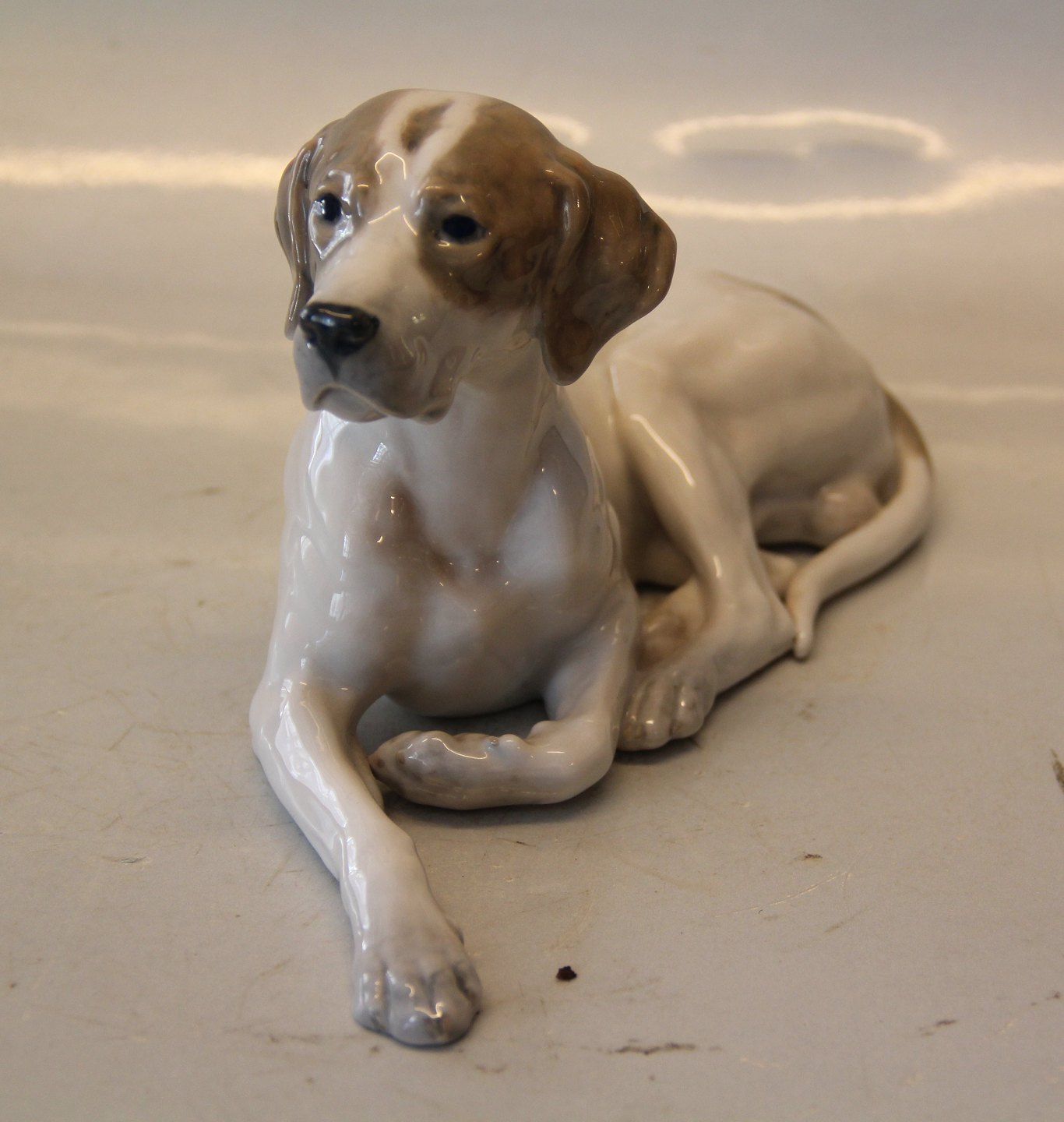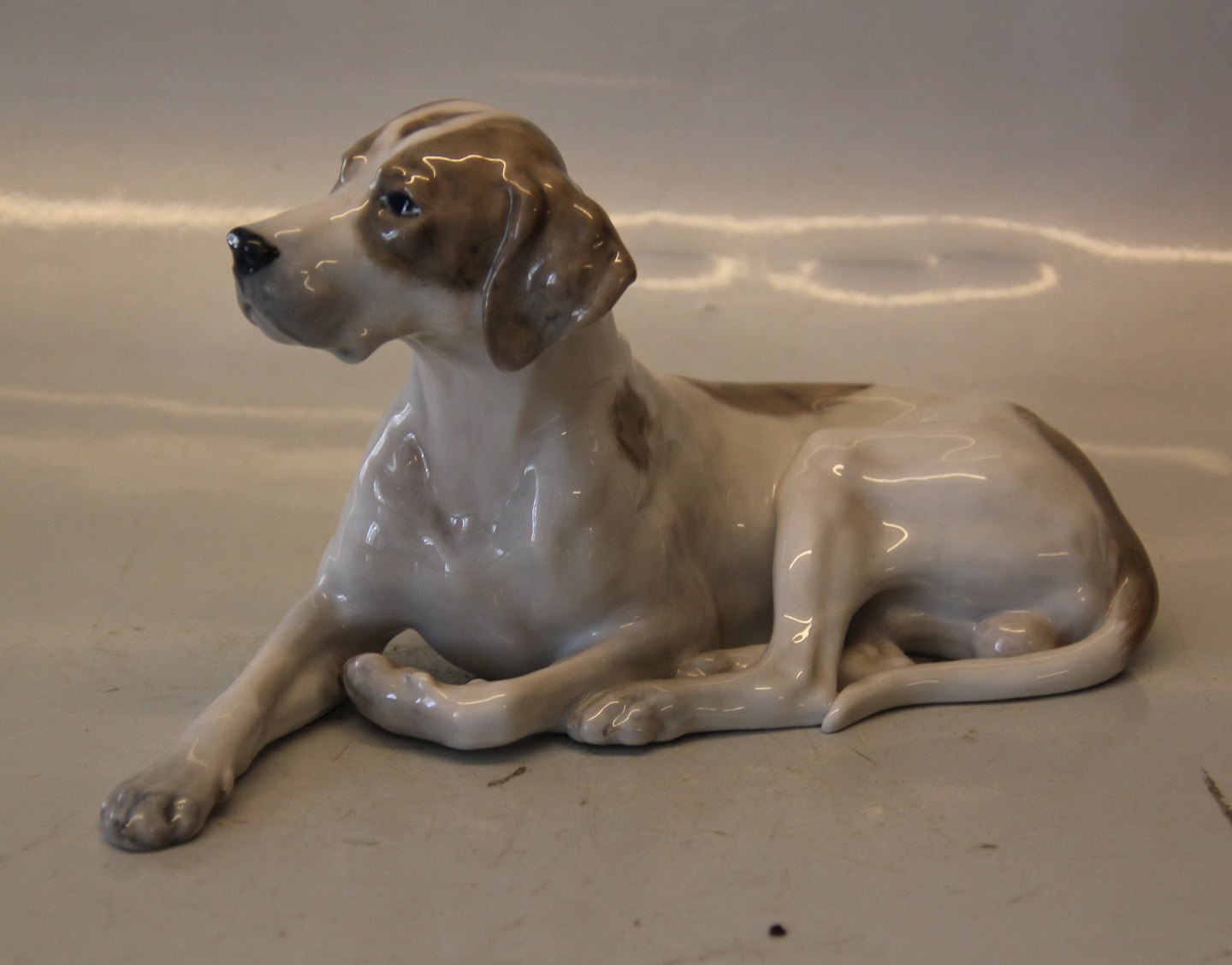 Kgl. figur fra Royal Copenhagen Orange Liggende Pointer 1635 13 x 24 cm I hel og fin stand En hund fra Den kongelige Porcelænsfabrik KPM Design Lauritz Jensen 1914