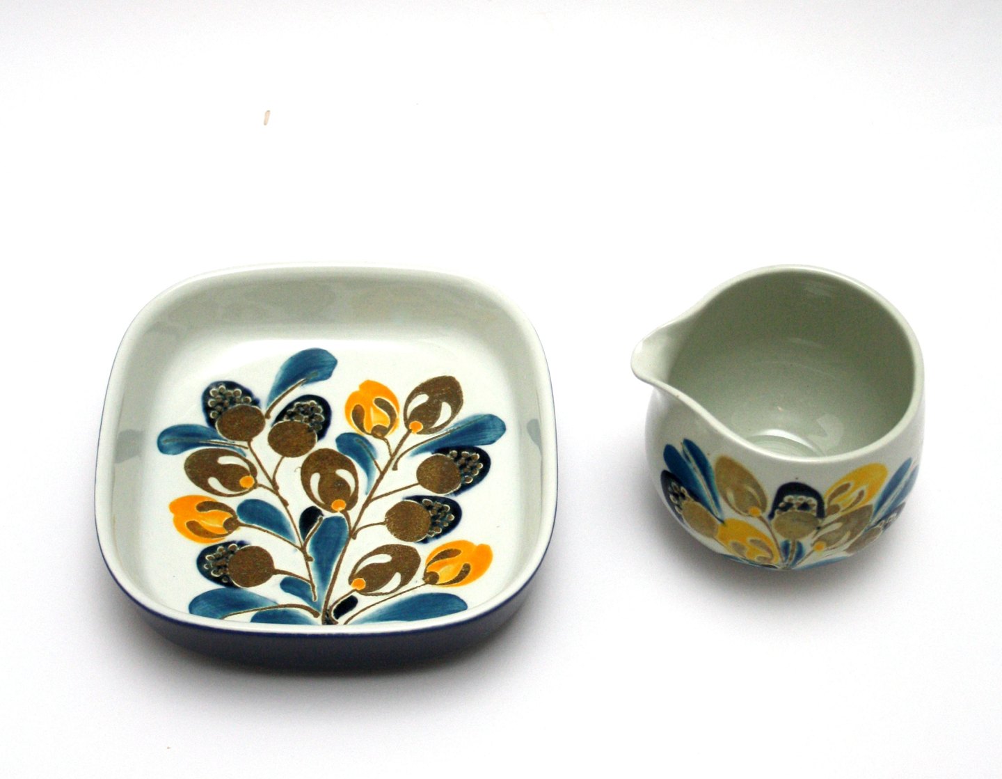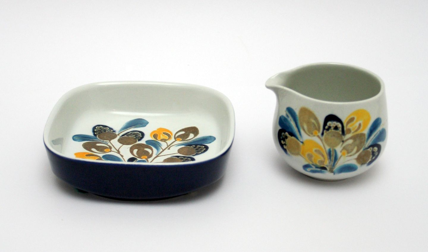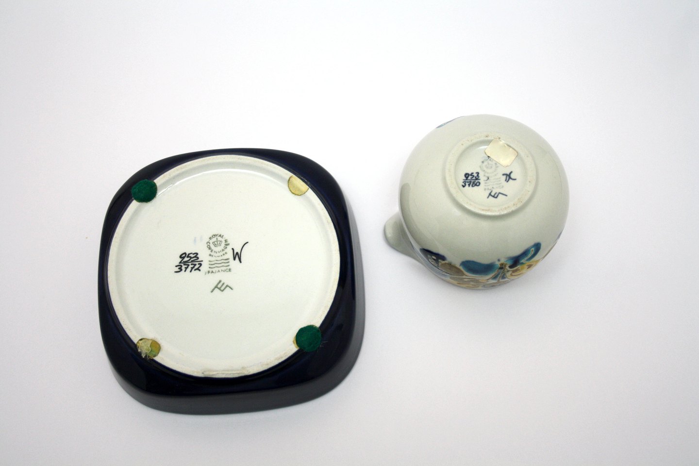 Royal Copenhagen, Kunstfajance, Lille firkantet fad og flødekande, designet af Ellen Malmer.