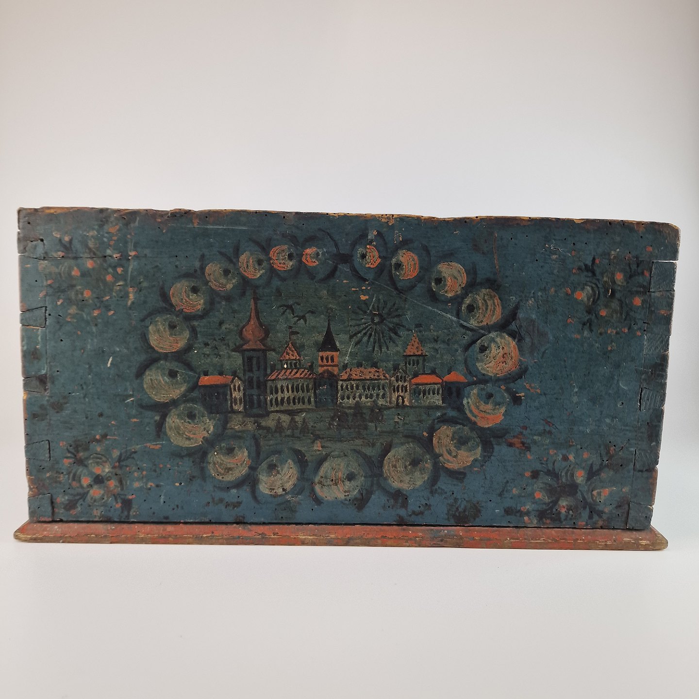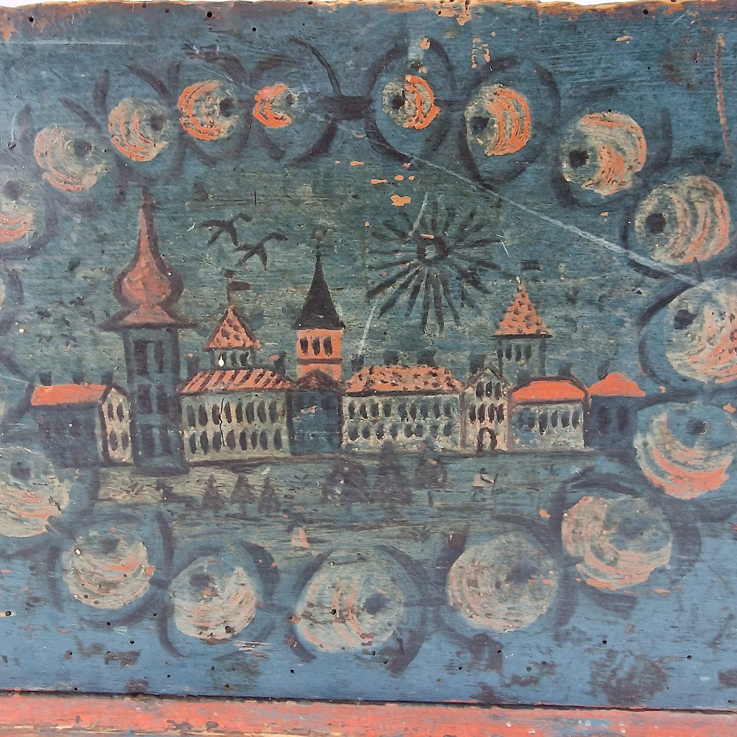 Med håndmalet motiv af by på den ene side og engel på pedistal på den anden.