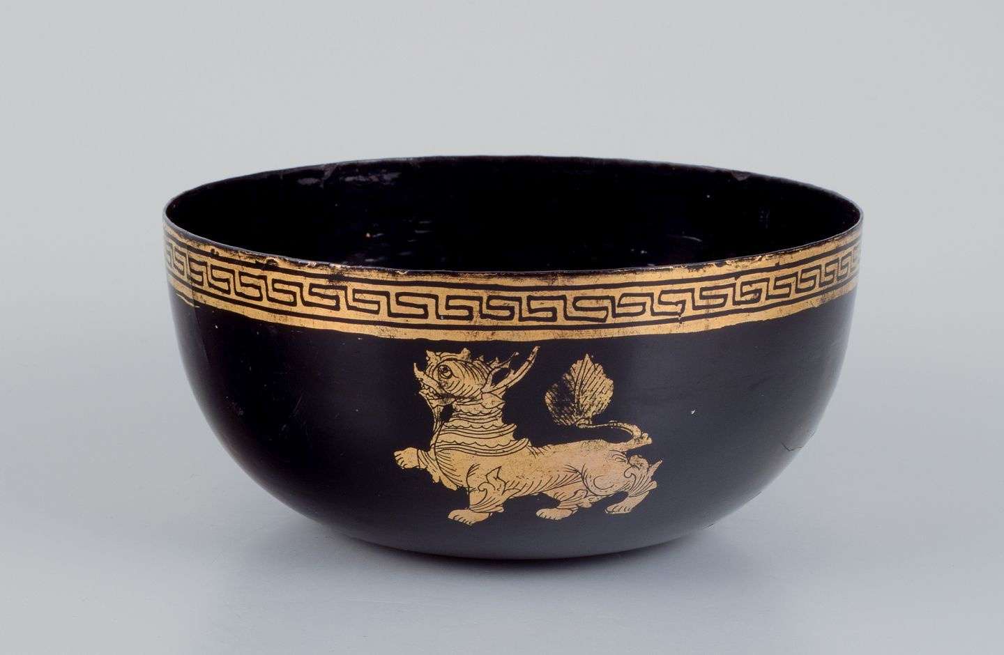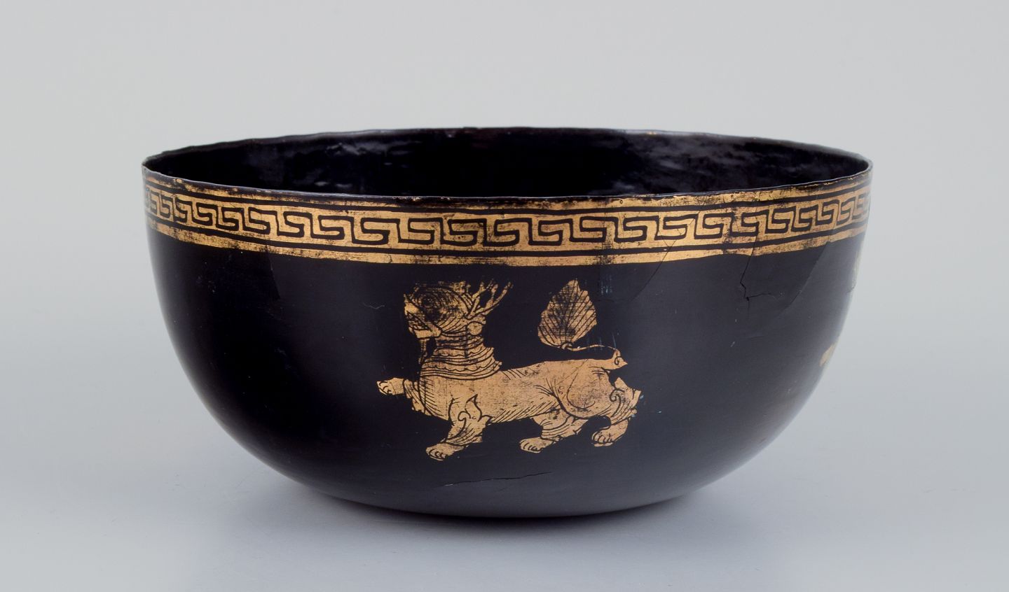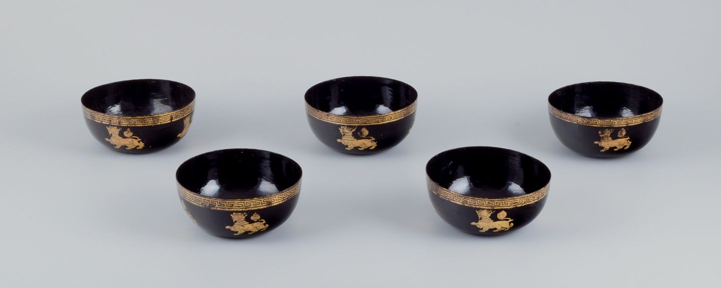 Fem asiatiske skåle i papmache. Dekoreret i guld og sort.