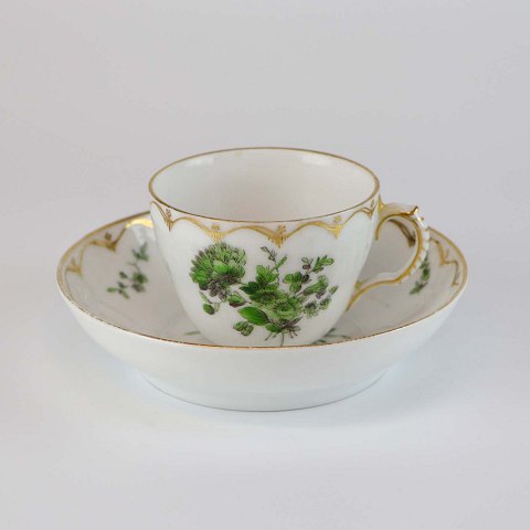 Antik kop og underkop i svejfet hvidt porcelæn med motiv af grønne blomster og blade