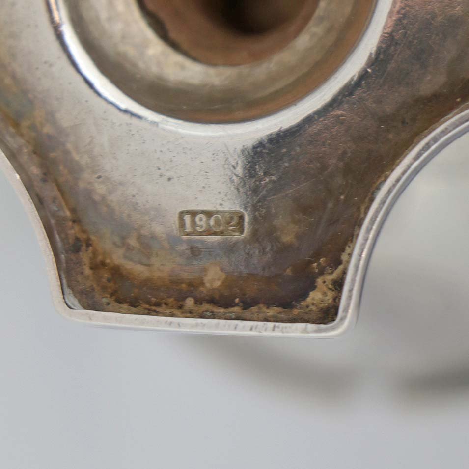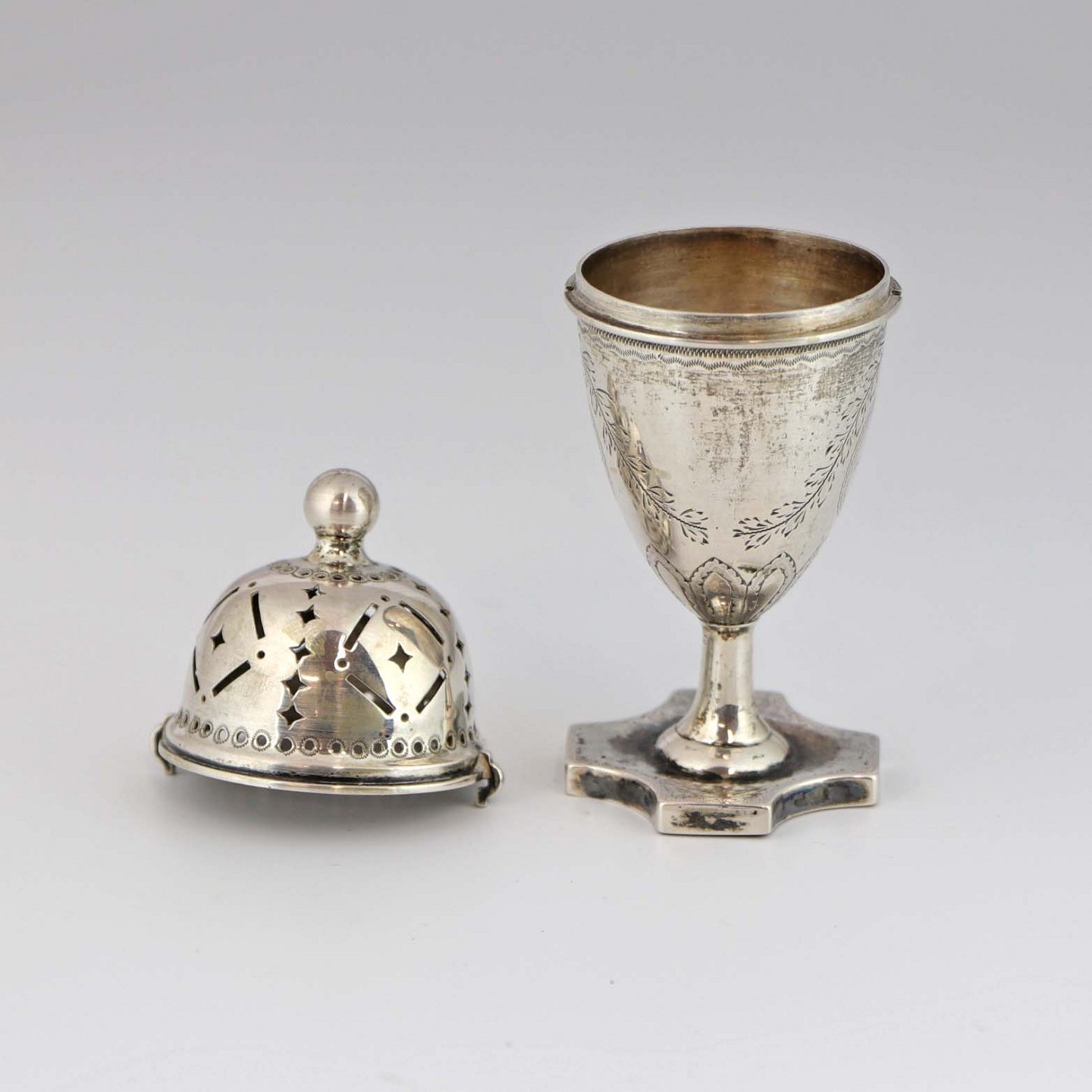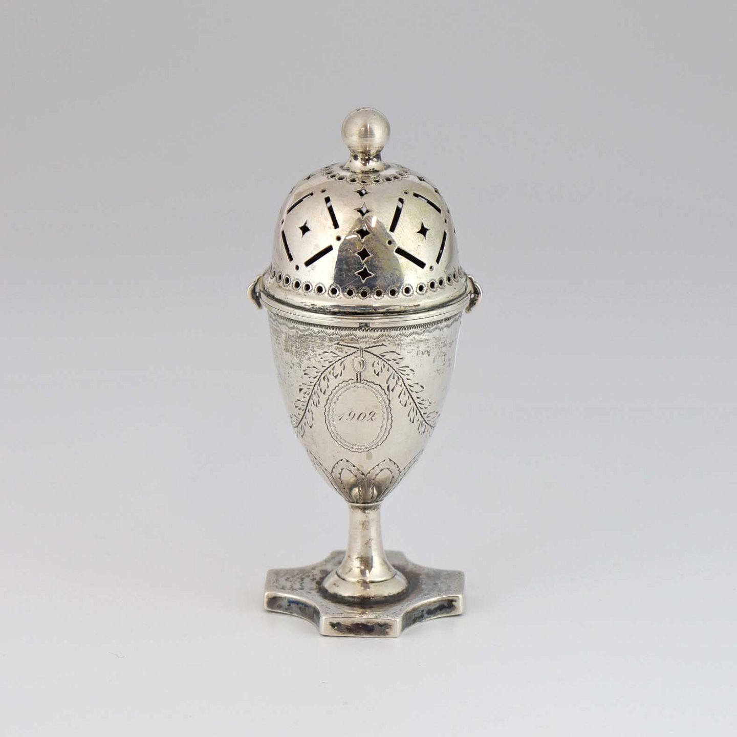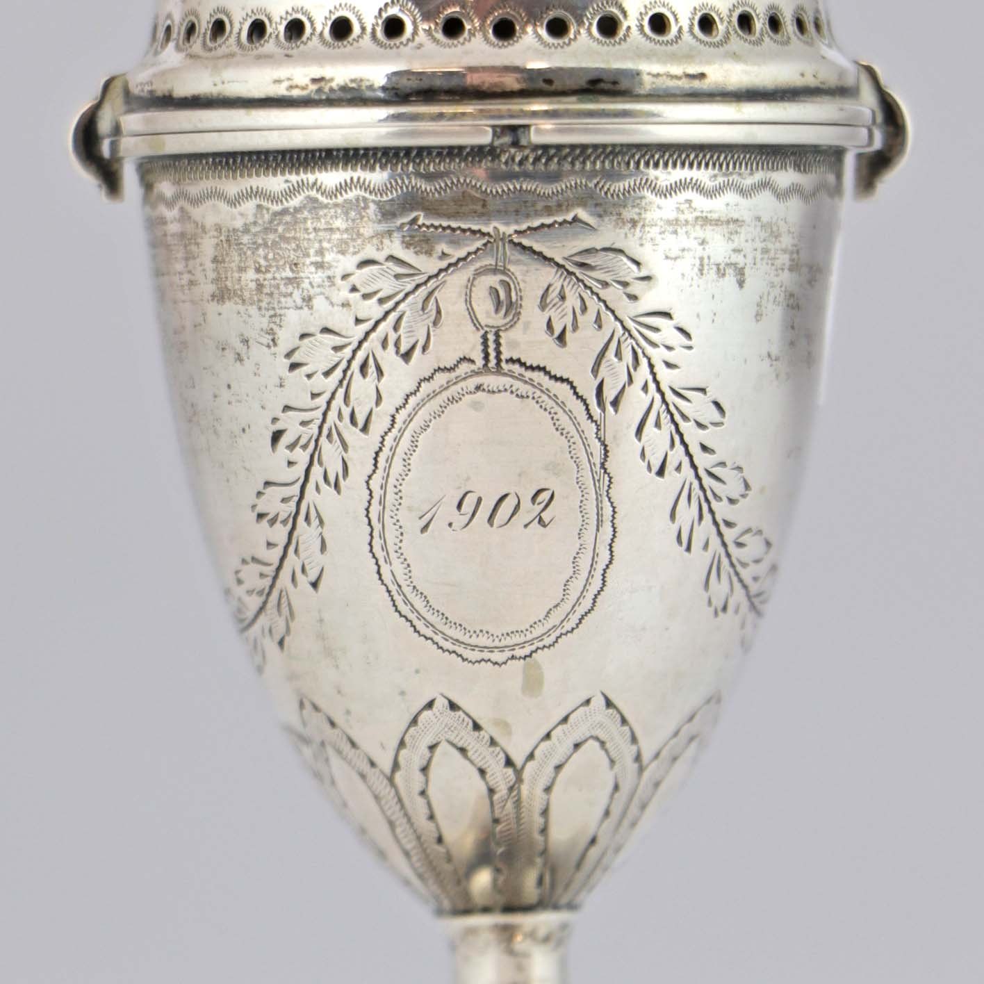 Strøbøsse af prøvesølv. Dekoreret med indgraveret initialer og år 1902