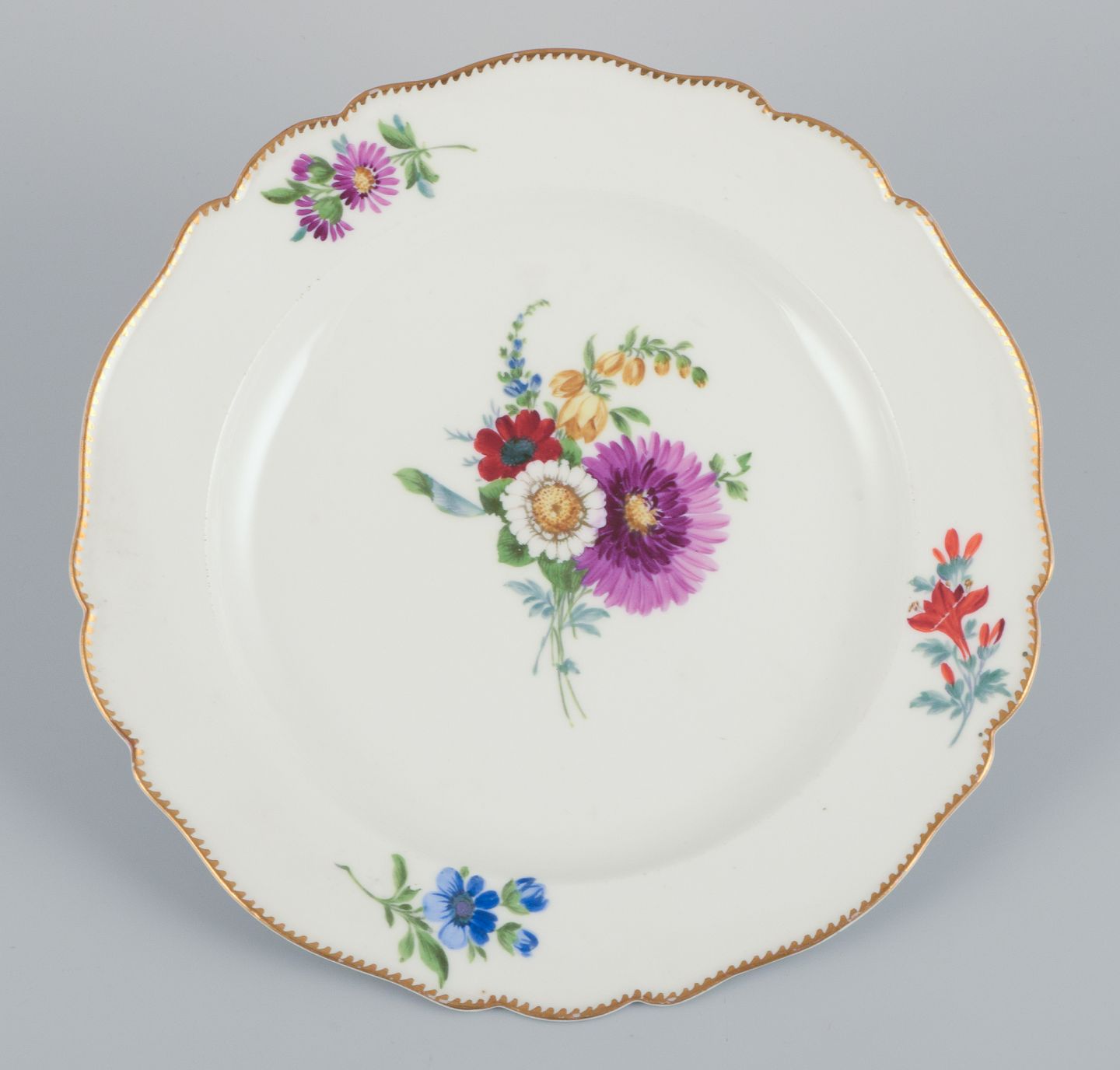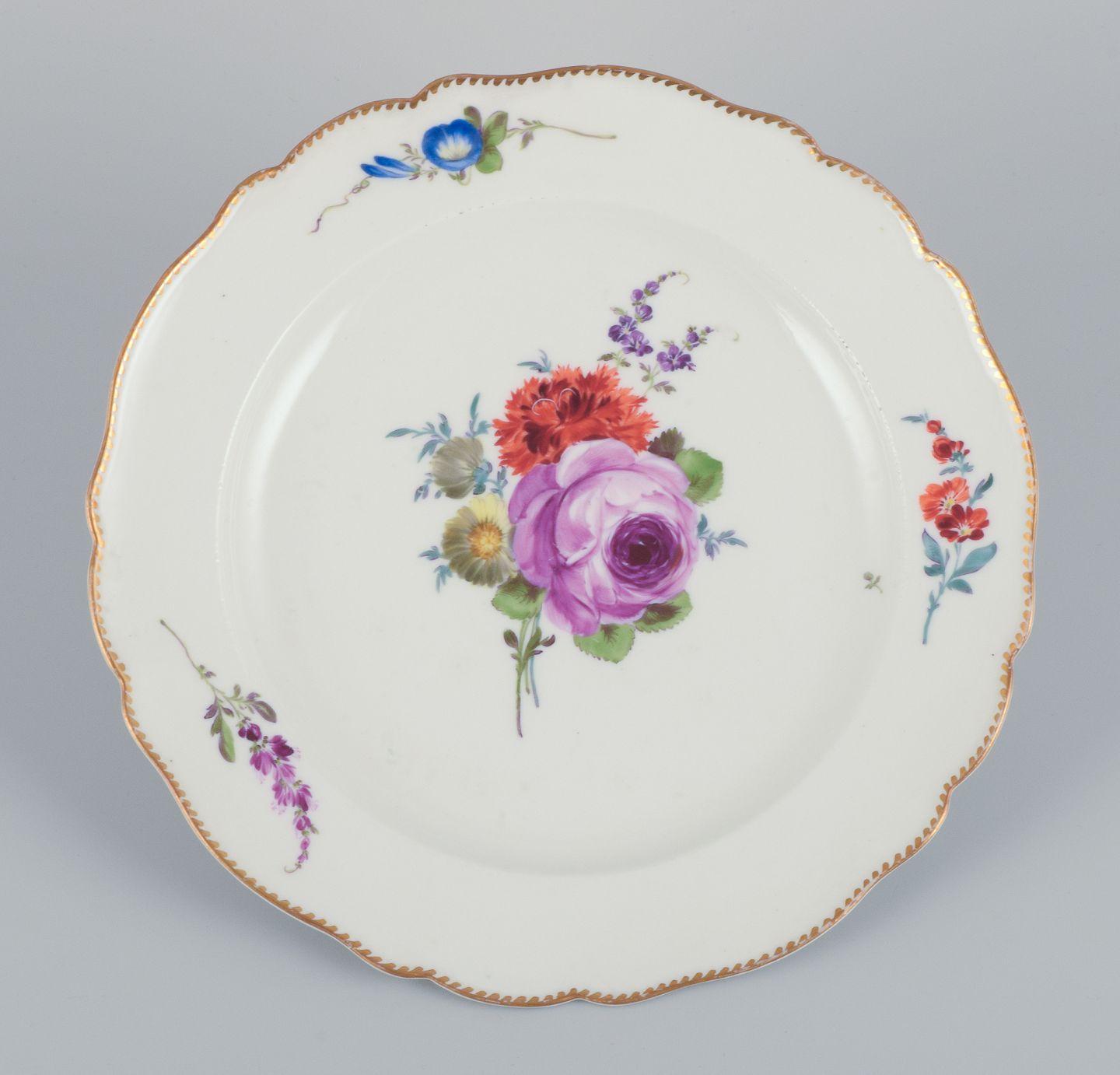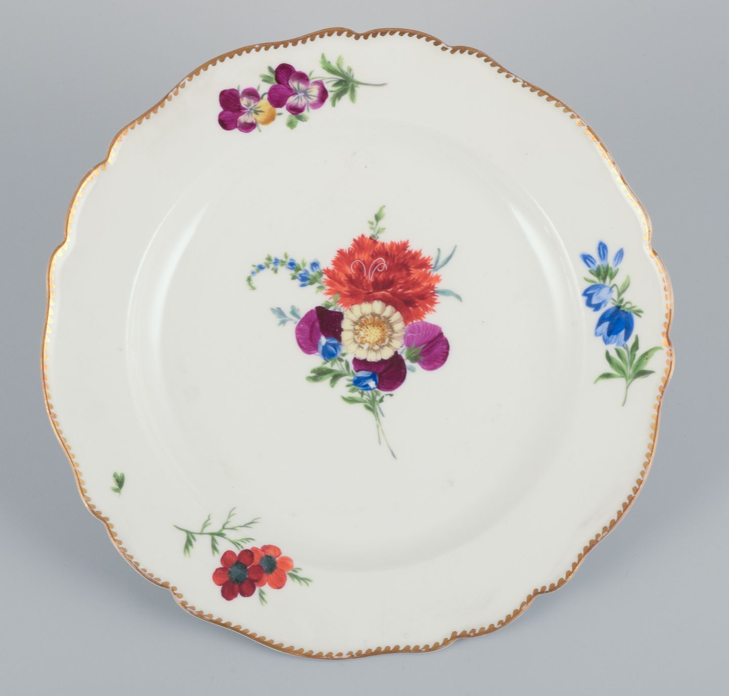 Meissen, Tyskland. Et sæt på seks antikke middagstallerkner i porcelæn. Håndmalet med polykrome blomstermotiver.