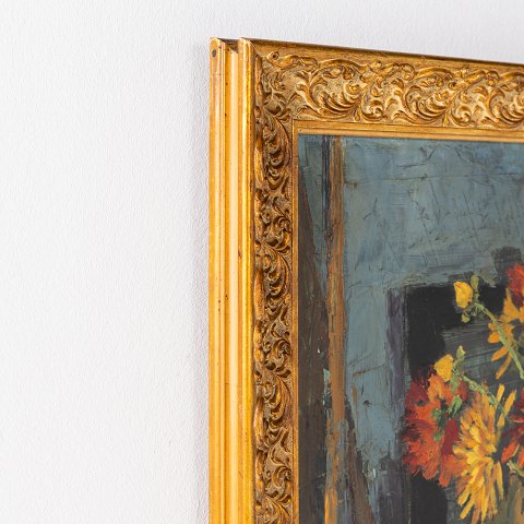 Maleri. Opstilling med blomster i udskåret ramme. Signeret.