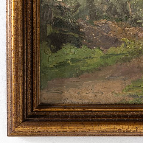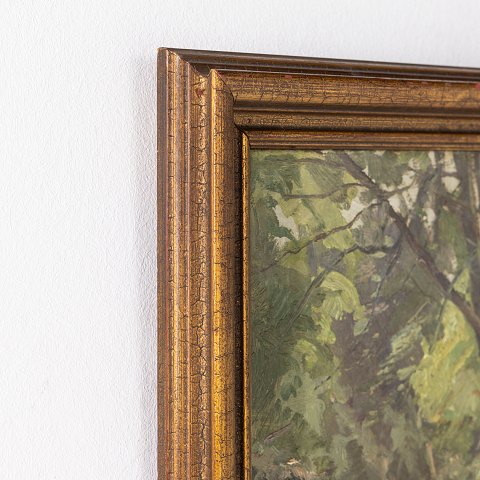 Olie på lærred. Forstbotanisk have i juni, med guldbemalet ramme. Signeret.