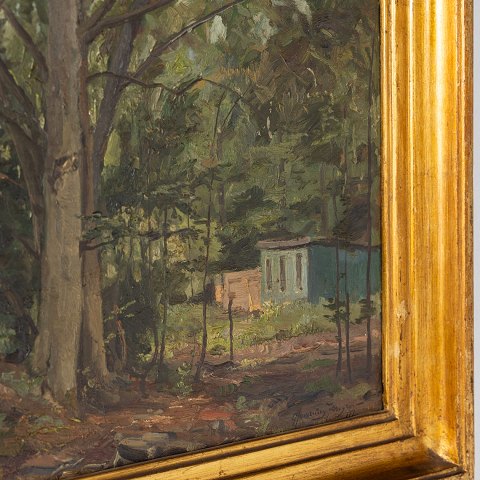 Olie på lærred. 'Parken, juli' fra 1941 med guldbemalet ramme. Signeret. Note på bagsiden.