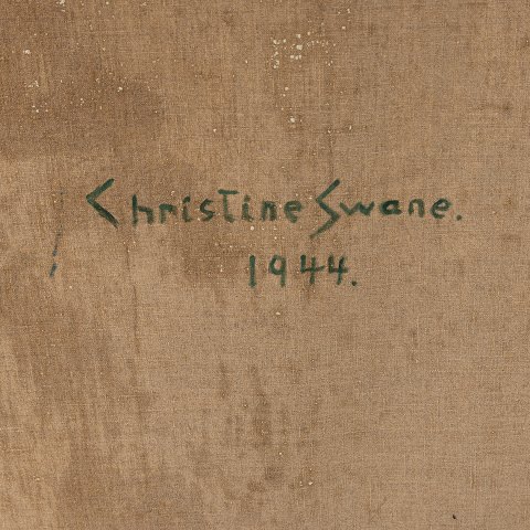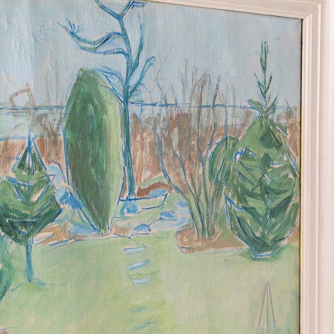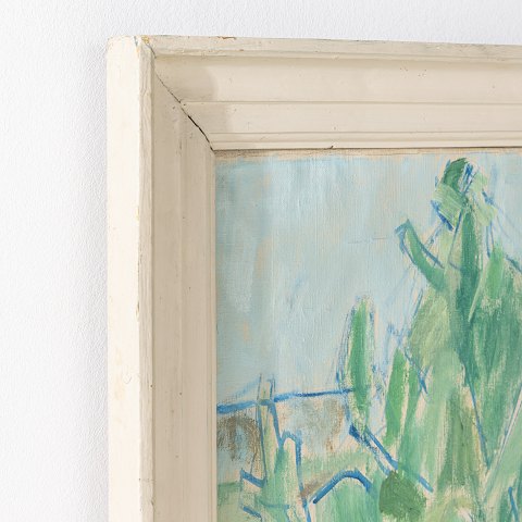 Maleri. 'Haveparti' med blå ramme fra 1944. Signeret.