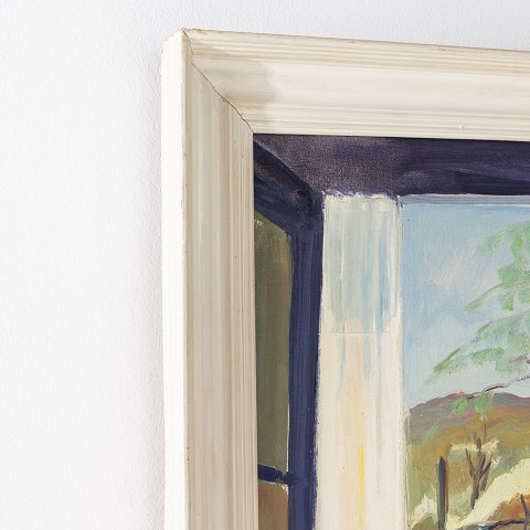 Maleri. 'Blomster i vinduet' med hvid ramme. Signeret.