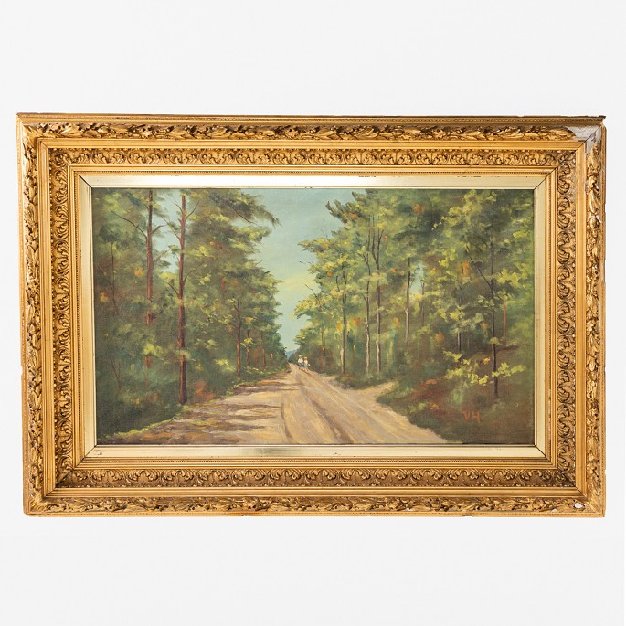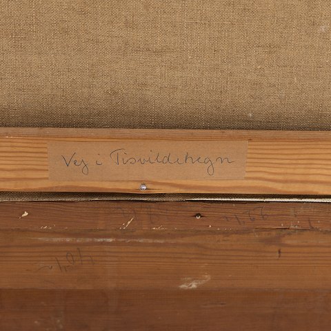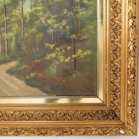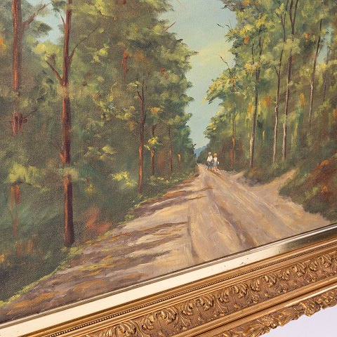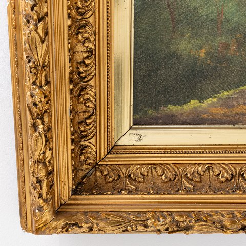 Maleri af skovlandskab i stor detaljeret guldramme. Signeret.