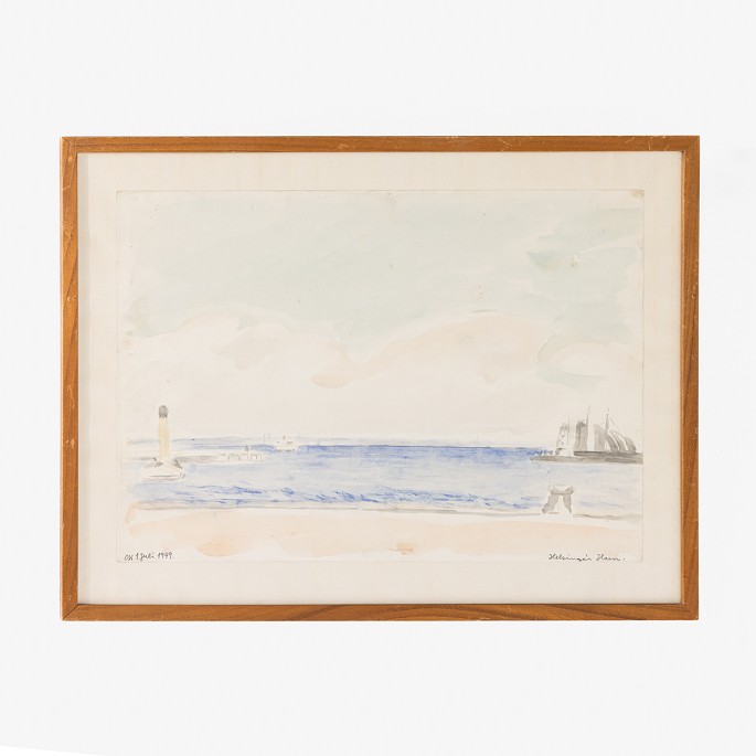Akvarel i pastelfarver i træramme. Motiv af Helsingør Havn fra juli 1949. Signeret.