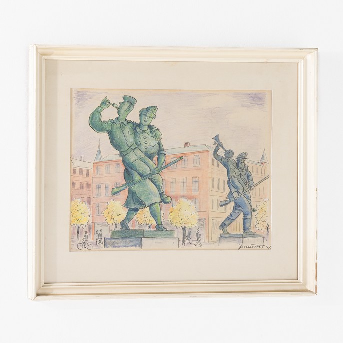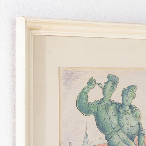 Den Lille Hornblæser'. Tegning fra 1947 i hvid ramme. Signeret.
