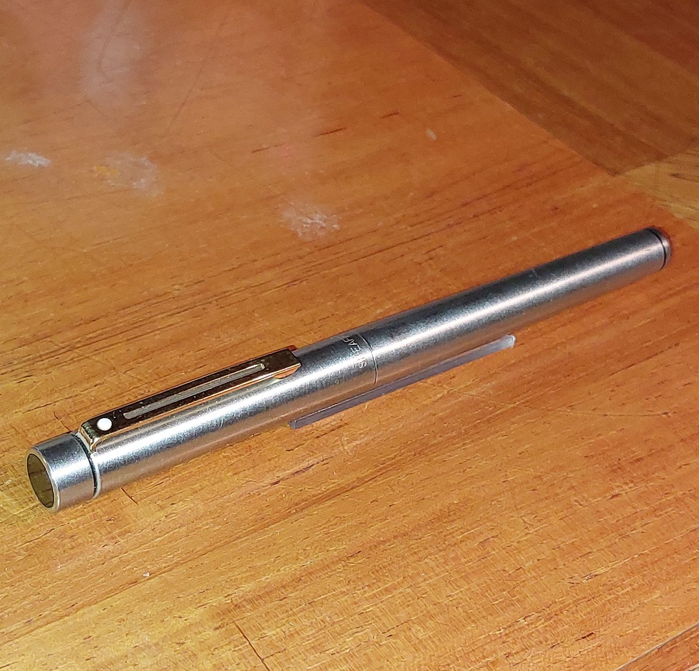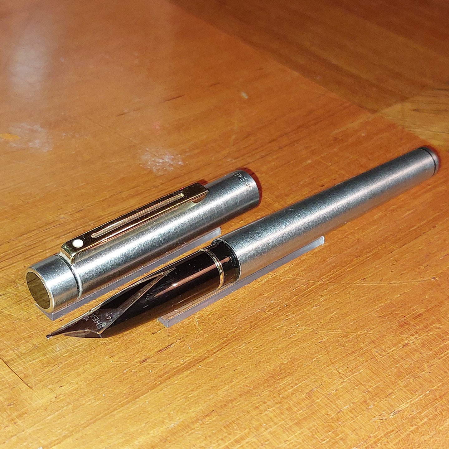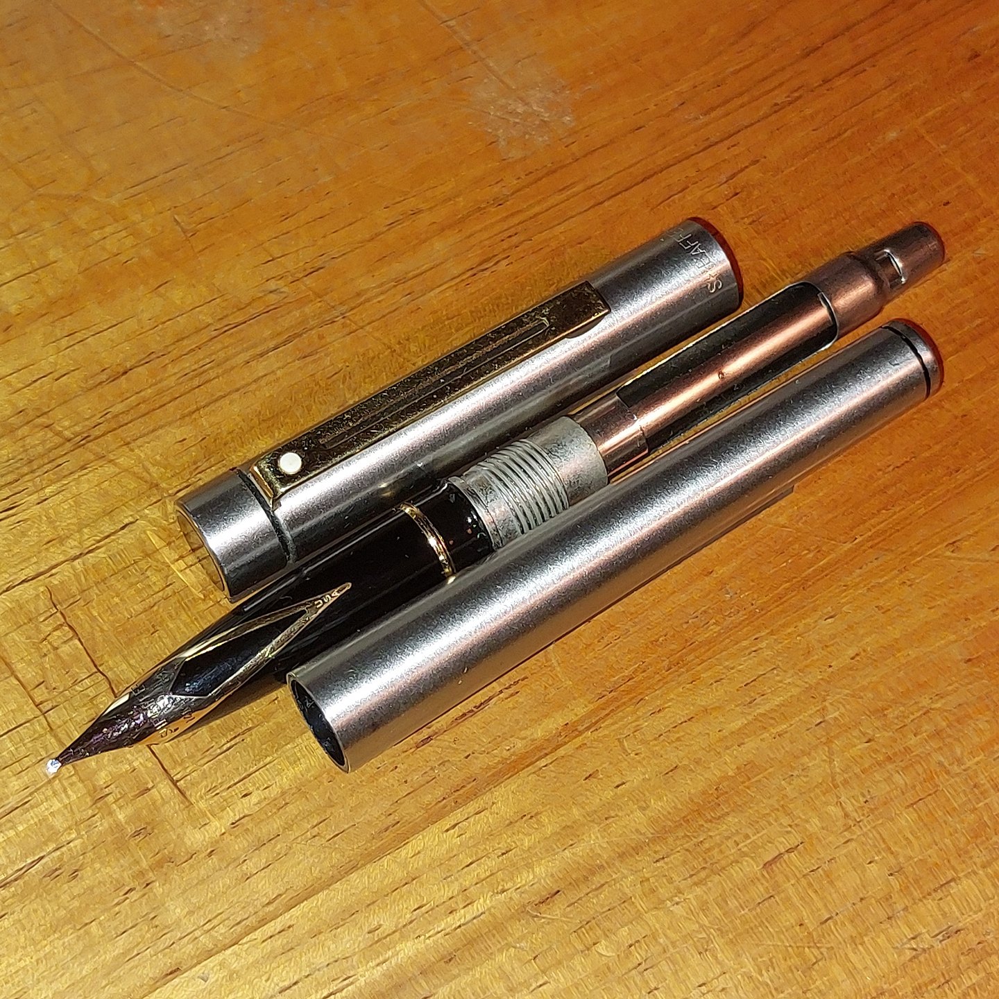Sheaffer Targa fountain pen in steel with 14 Karat gold nib. In good and usable condition with old rubber sac