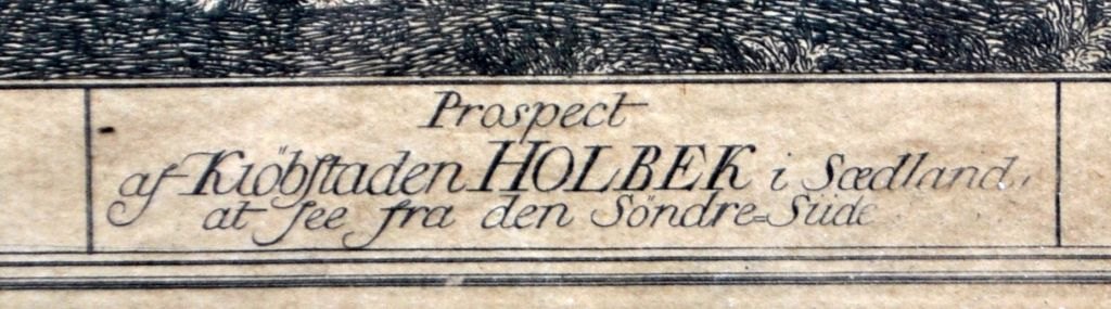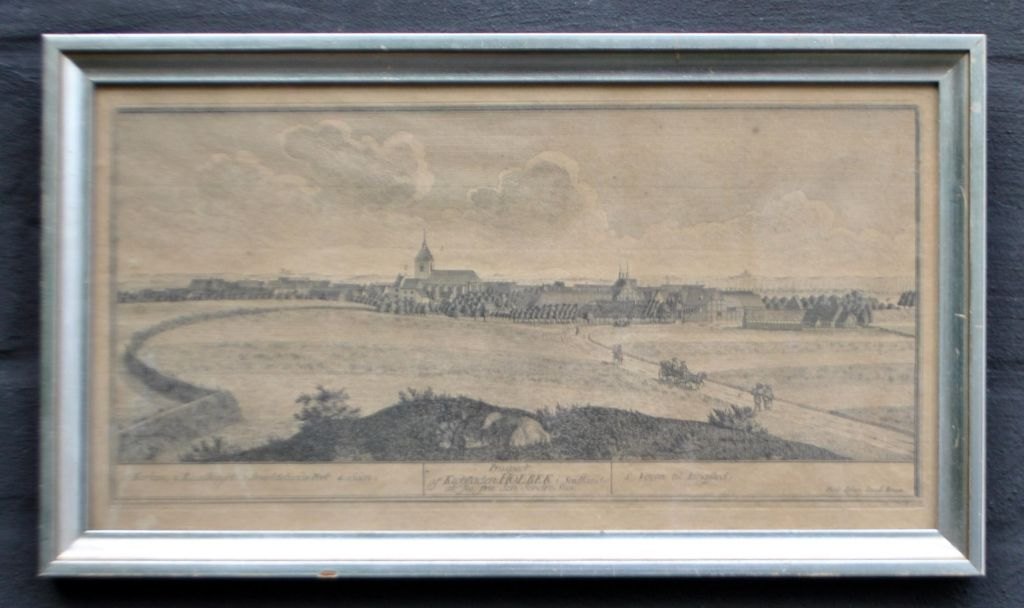 Bruun, Johan Jacob (1715 - 1789) Danmark. Prospekt af købstaden Holbæk. Kobberstik. 19,5 x 36 cm.  Indrammet i en sølvramme: 23 x 40 cm.  Perfekt stand!