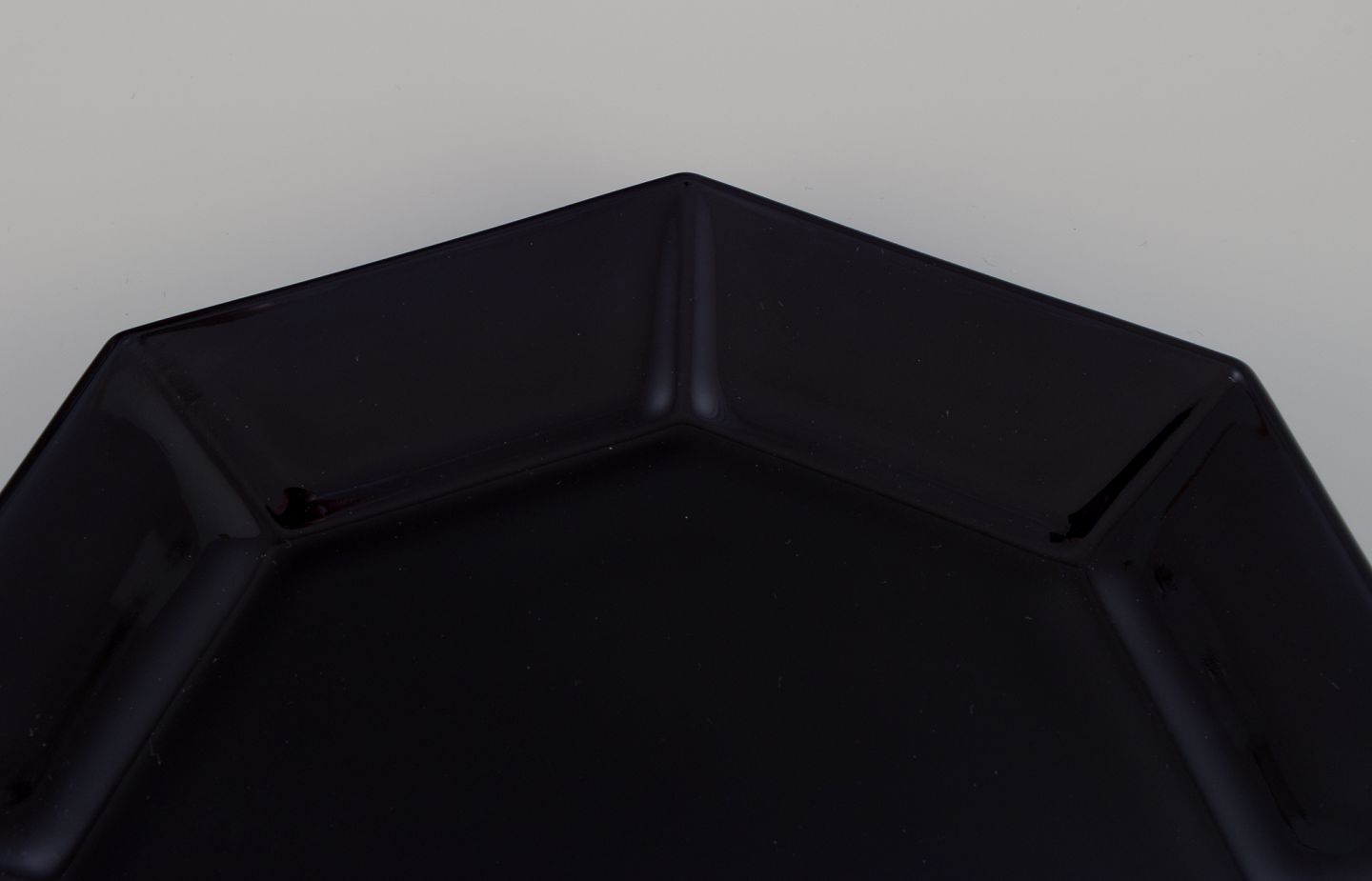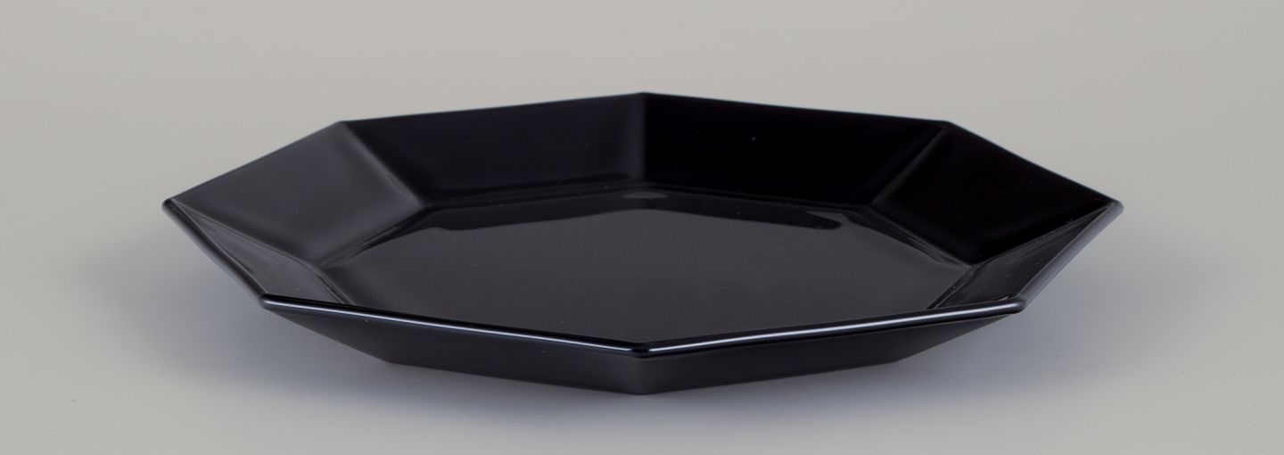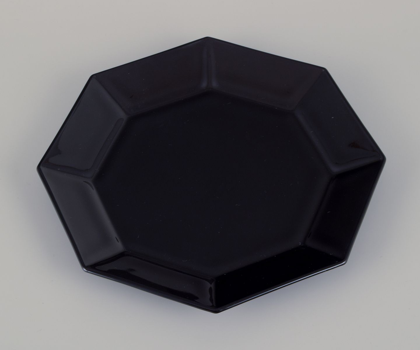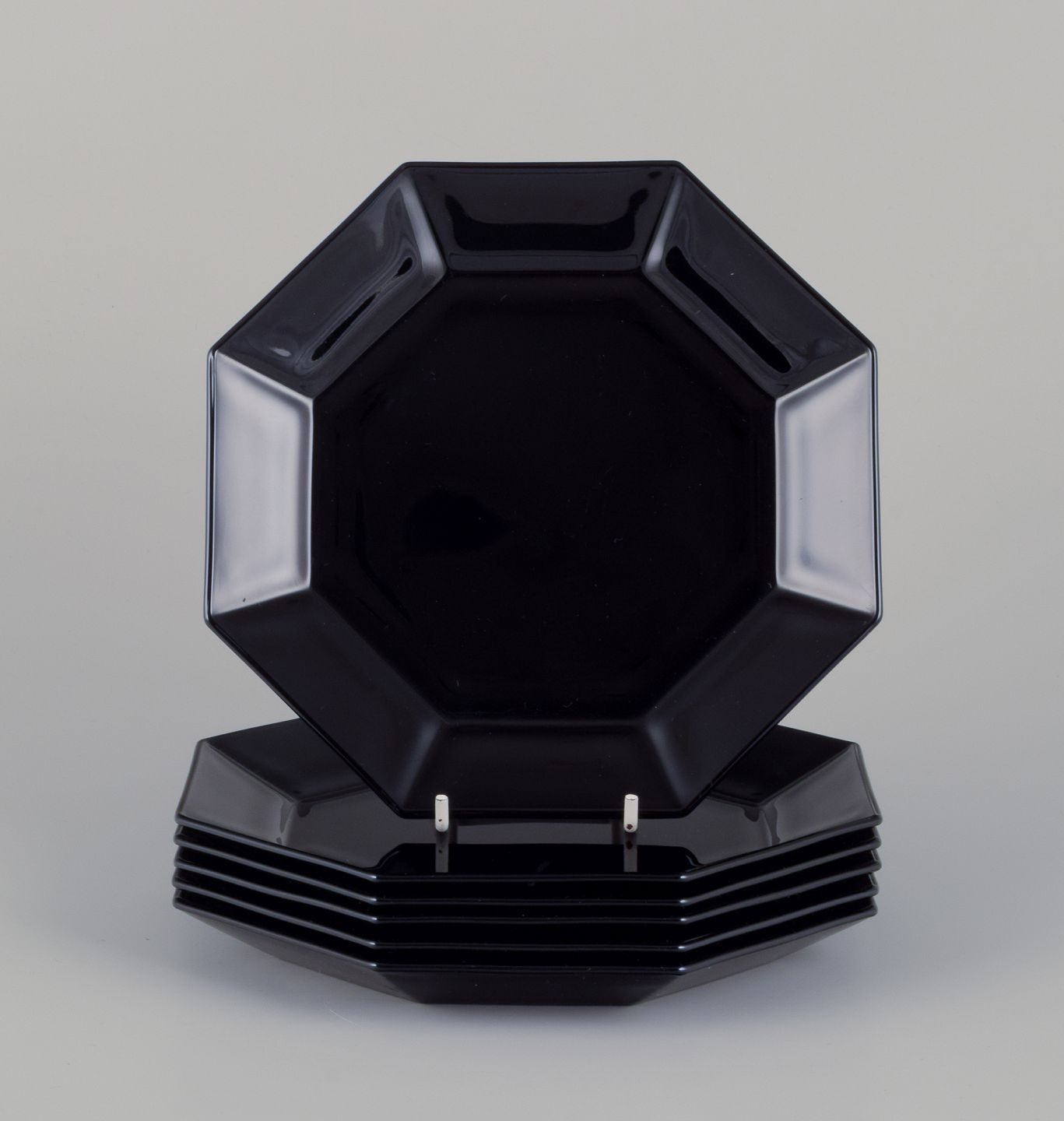 Et sæt på seks ottekantede tallerkner i sort glas.