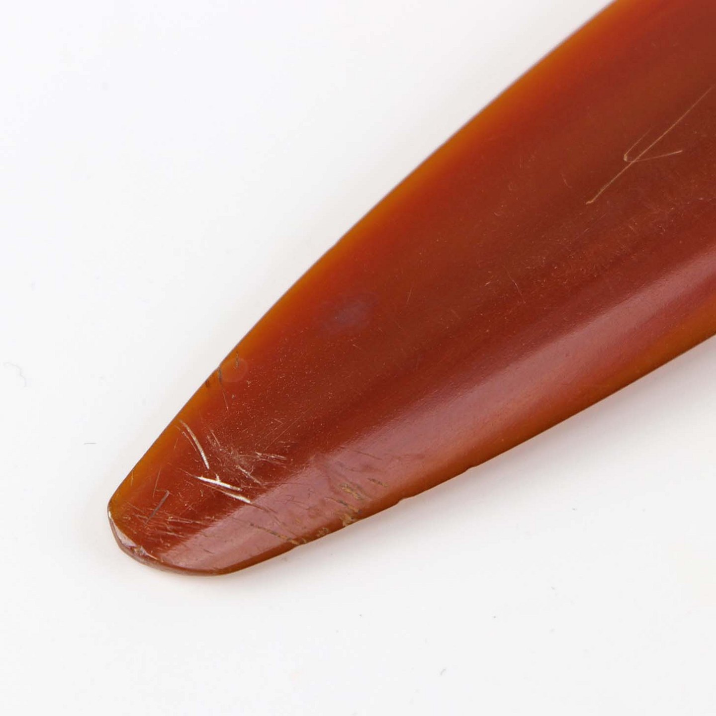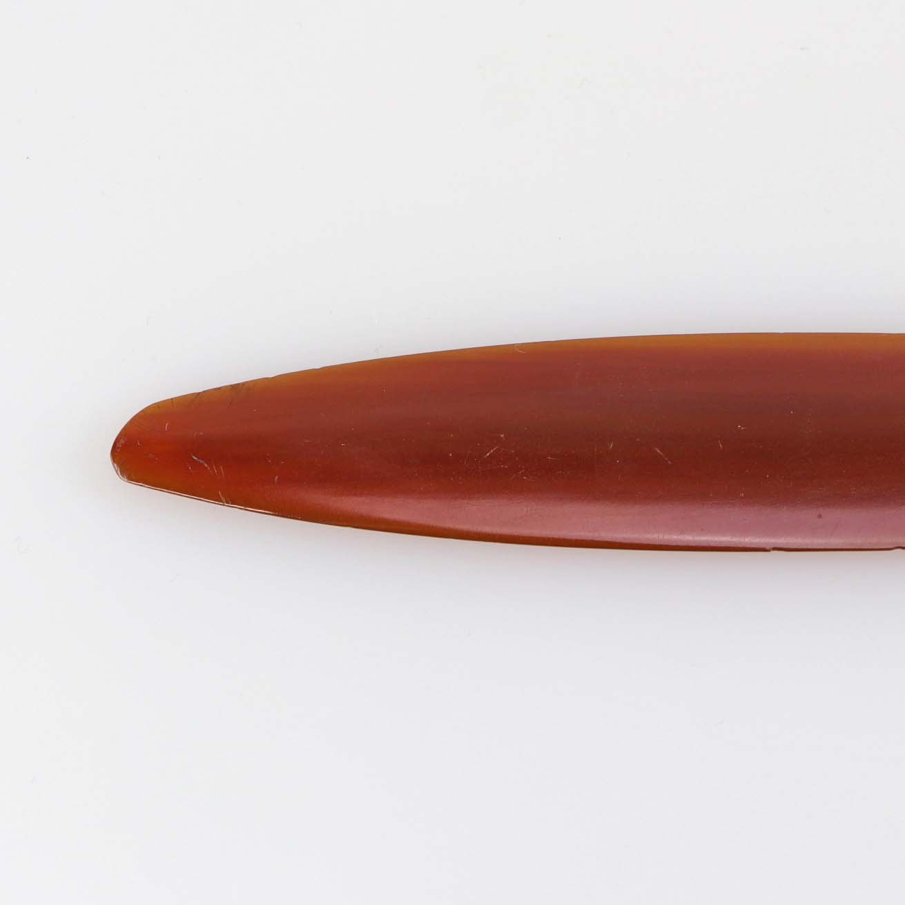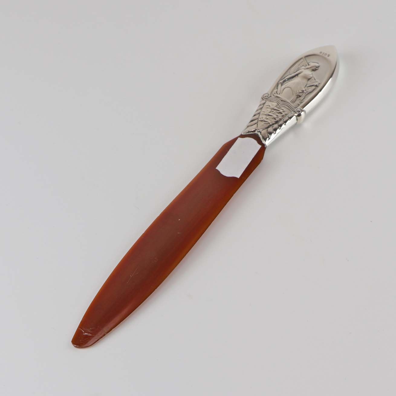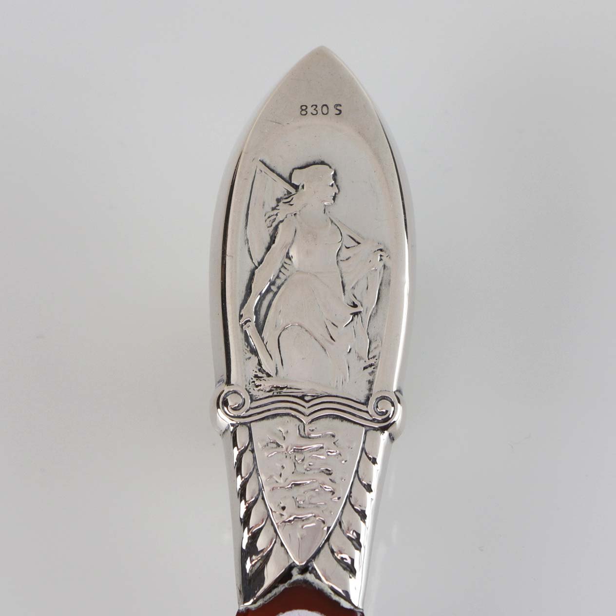 Brevkniv af ben. Top af sølv med motiv af kvinde med sværd og flag samt tre løver