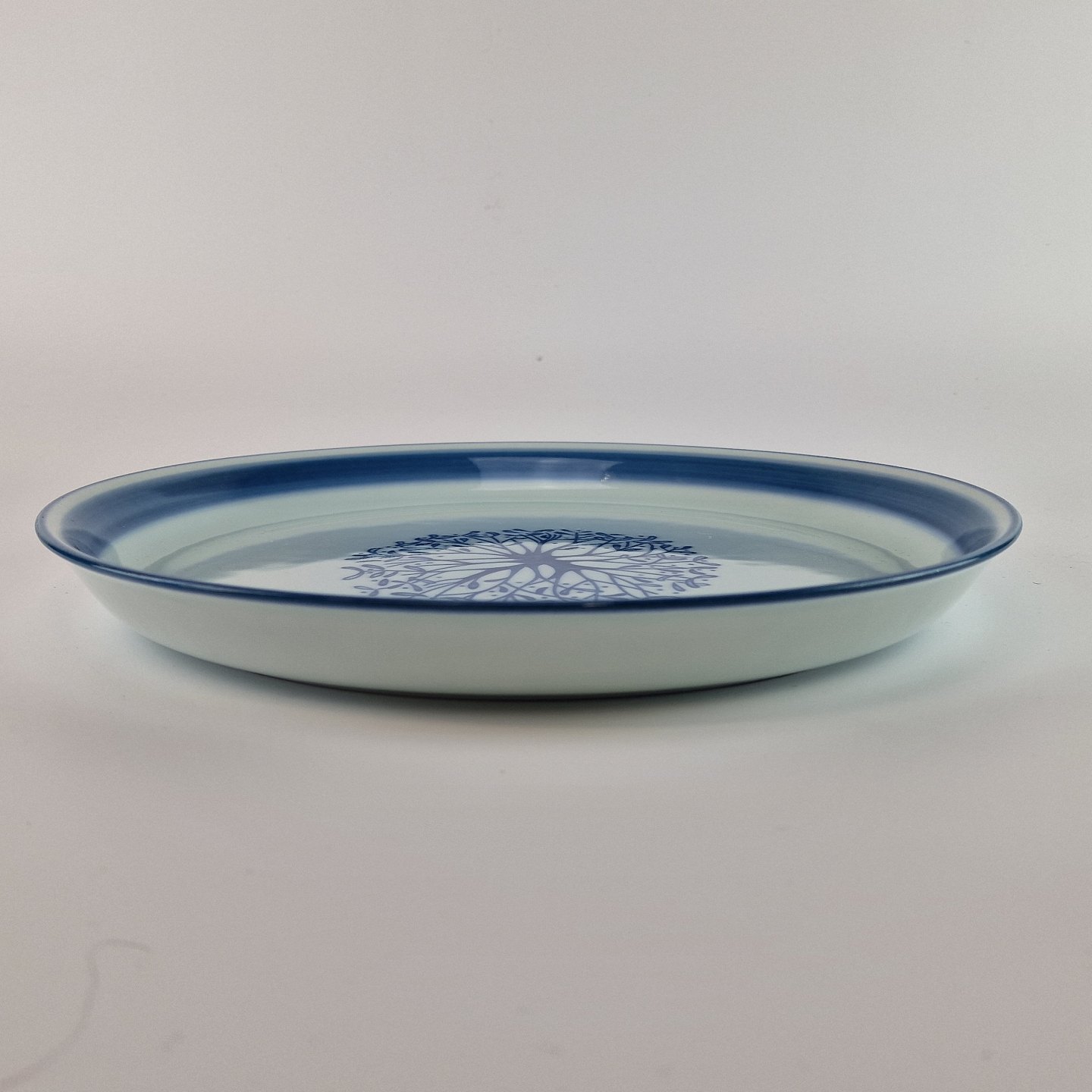 Stellets runde former er dækket med en silkeblød glasur og håndmalet med er lys almueblå farve lagt under glasuren. Stellet er ovnfast