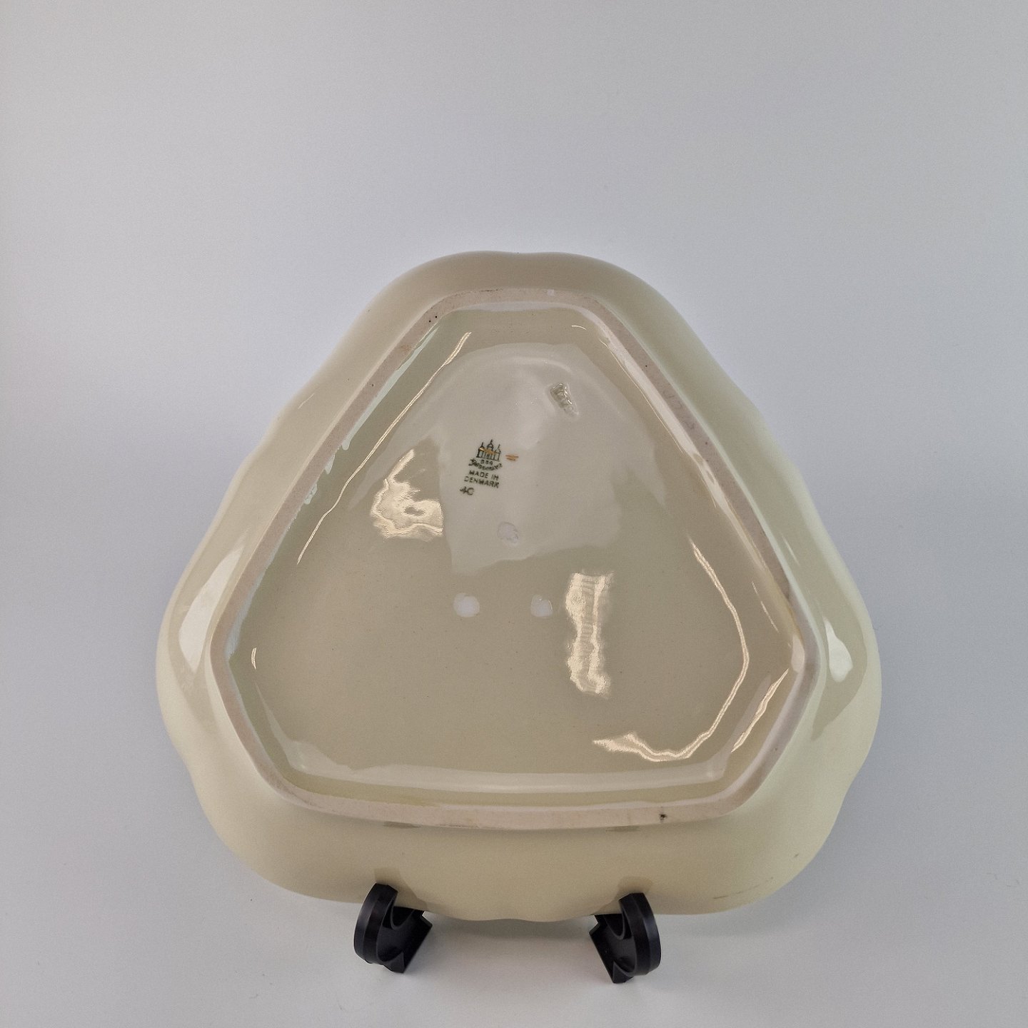 Åkjær er cremefarvet porcelæn med guldkant og mønster som ligner skæl